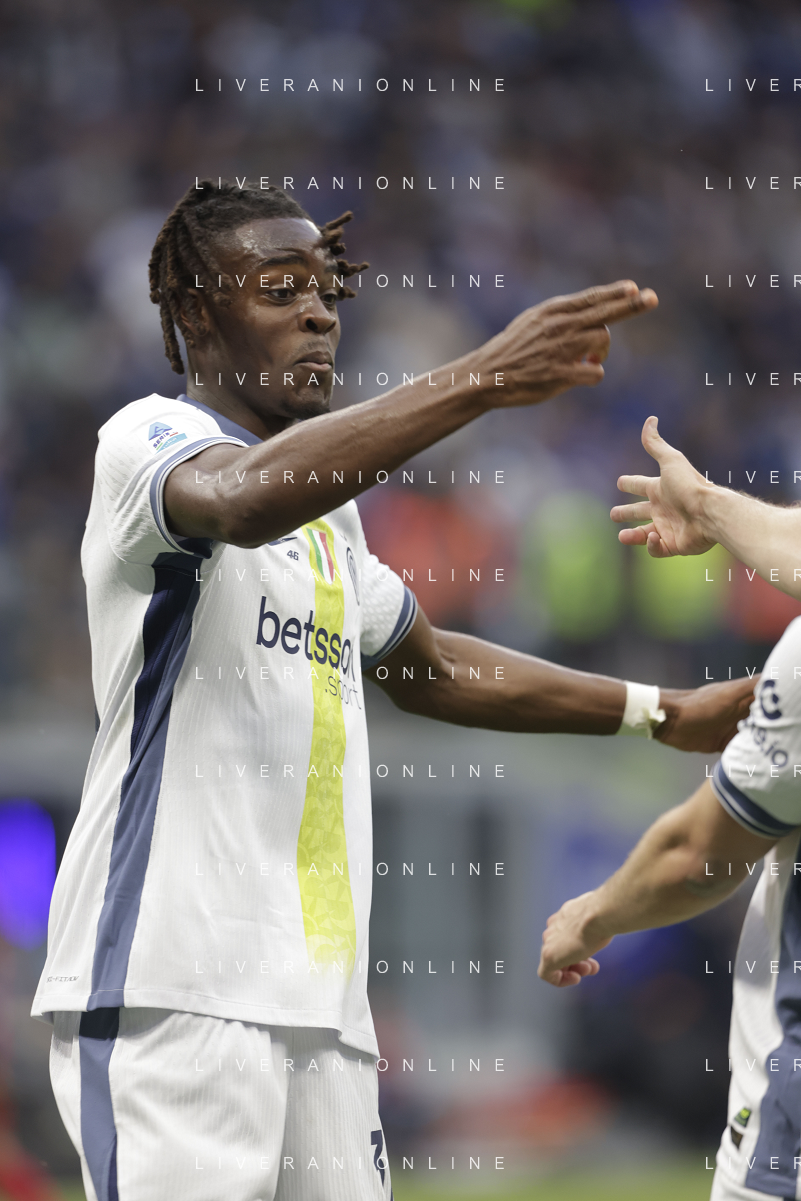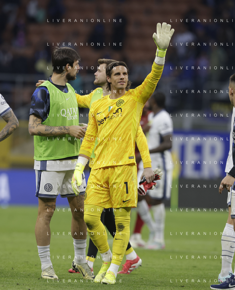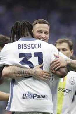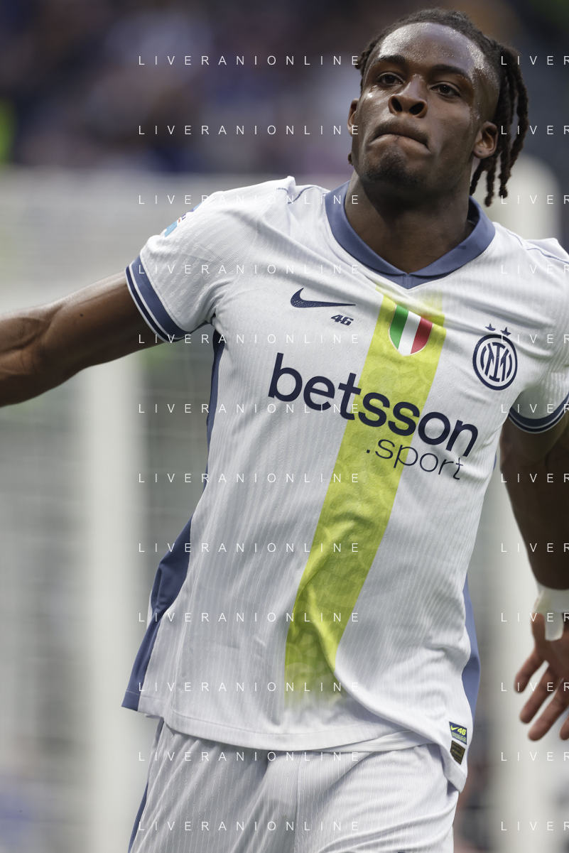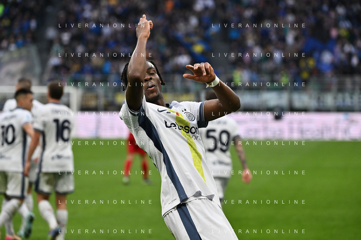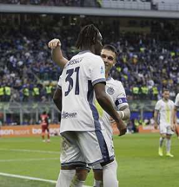 Inter vs Cagliari nella foto Yann Aurel Bisseck (Inter) esultanza dopo il gol del 3 a 1 Milano 12-04-2025 Stadio Giuseppe Meazza - San Siro Campionato Serie A Enilive - 32a giornata foto Roberto Garavaglia/Agenzia Aldo Liverani sas