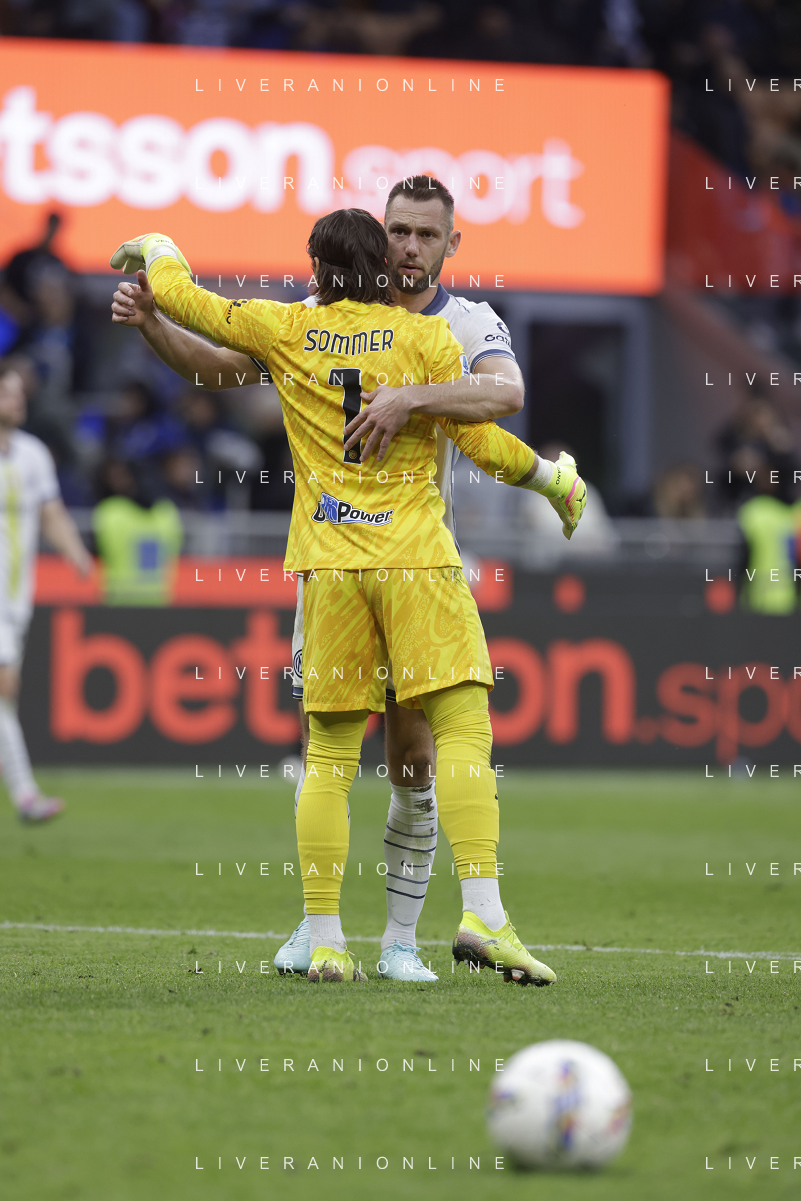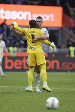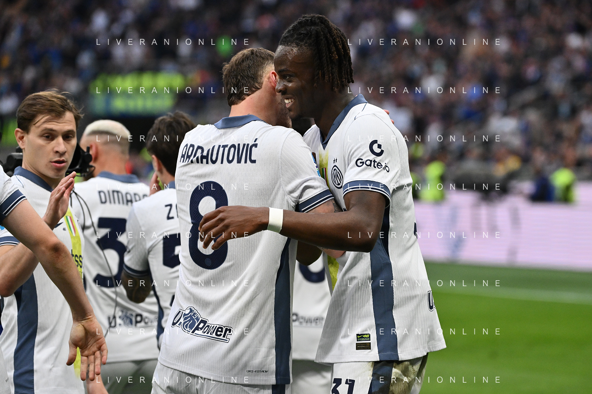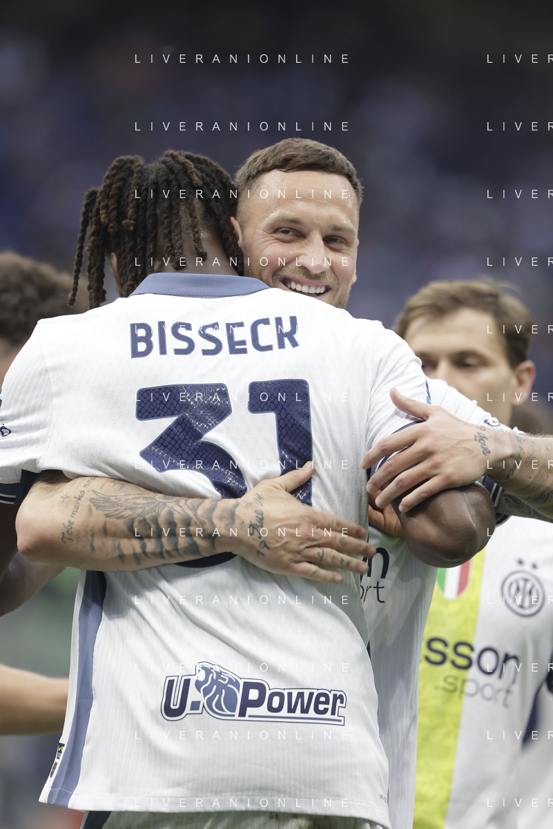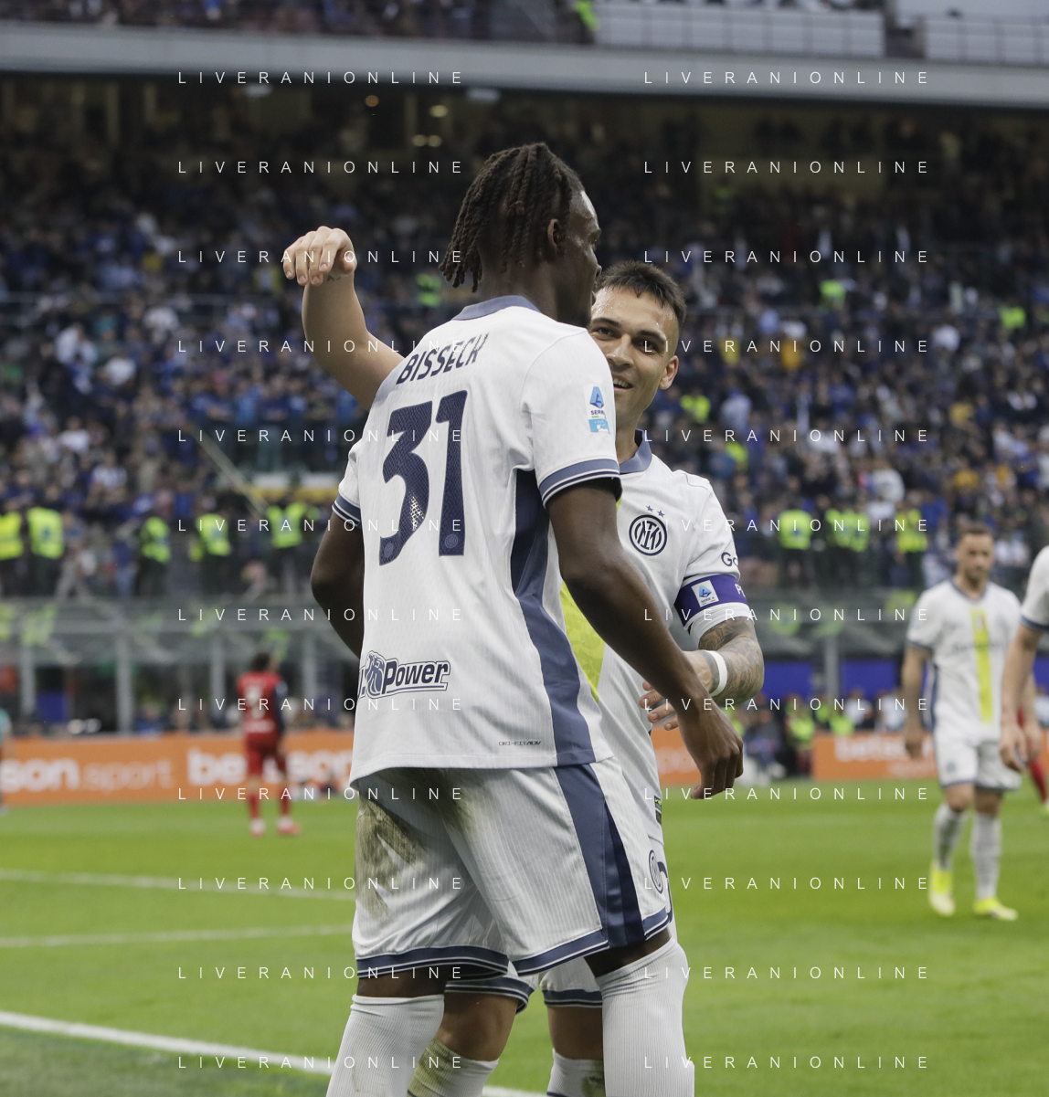 Inter vs Cagliari nella foto Yann Aurel Bisseck (Inter) e Marko Arnautovic (Inter) esultanza dopo il gol del 3 a 1 Milano 12-04-2025 Stadio Giuseppe Meazza - San Siro Campionato Serie A Enilive - 32a giornata foto Roberto Garavaglia/Agenzia Aldo Liverani sas