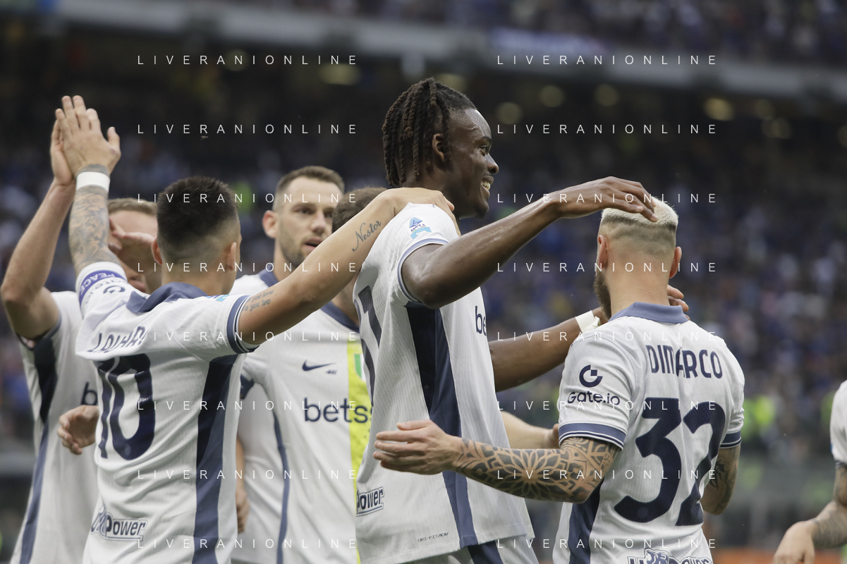 Inter vs Cagliari nella foto giocatori Inter esultanza dopo il gol dell'1 a 0 Milano 12-04-2025 Stadio Giuseppe Meazza - San Siro Campionato Serie A Enilive - 32a giornata foto Roberto Garavaglia/Agenzia Aldo Liverani sas