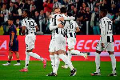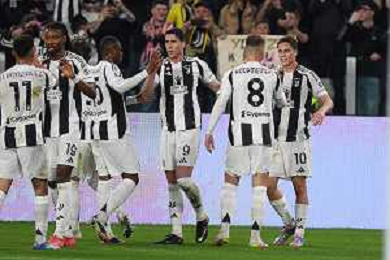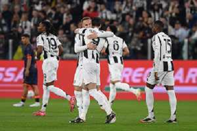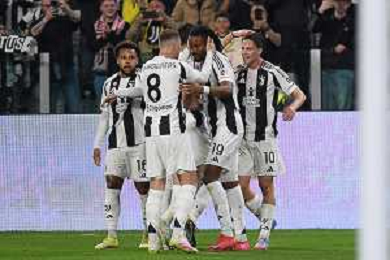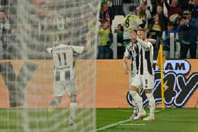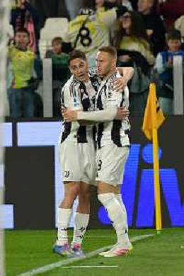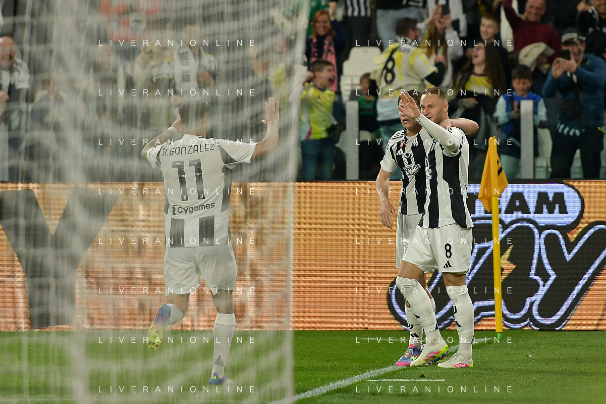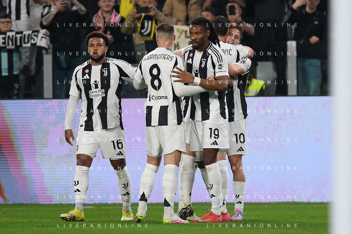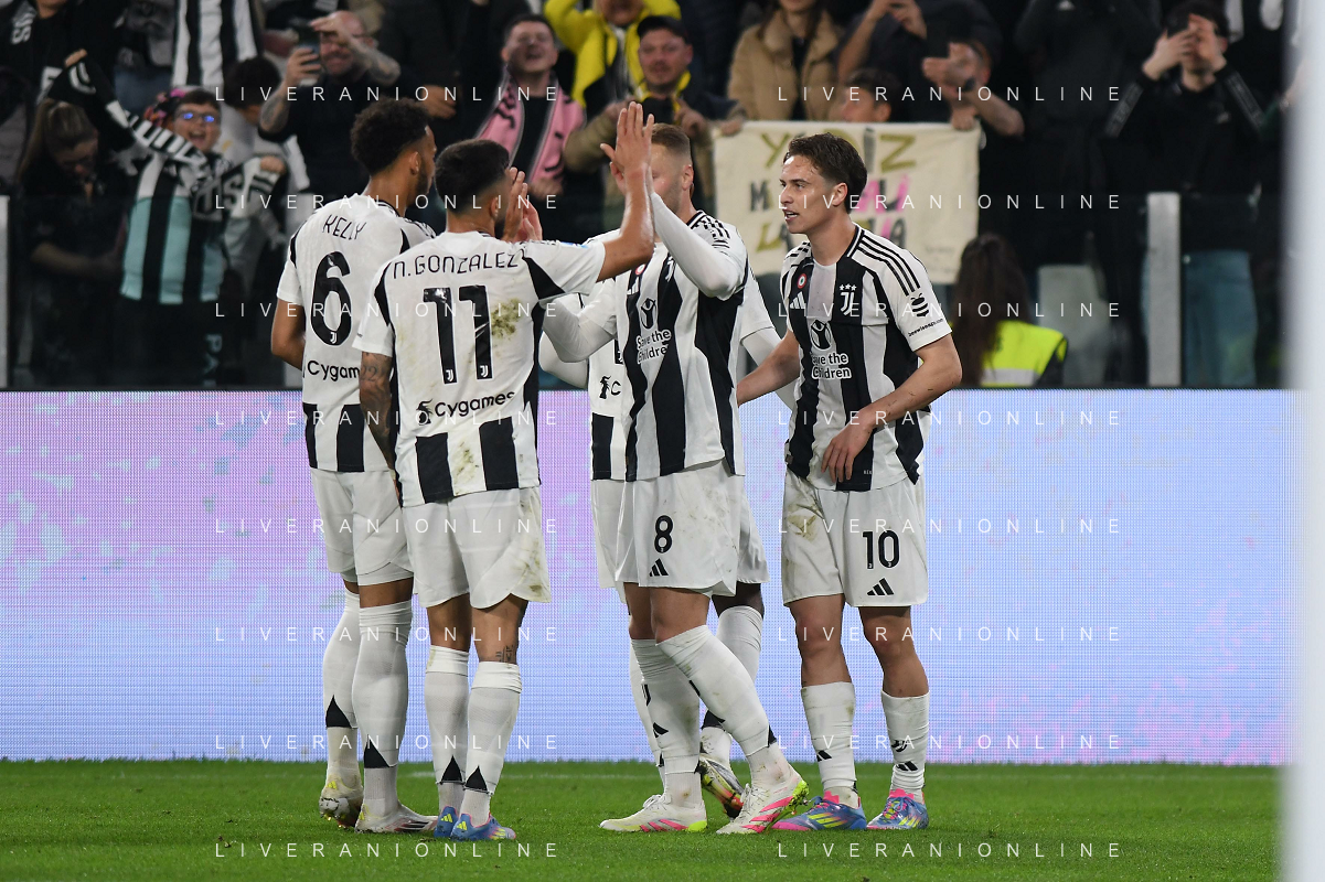 TVEM April 12, 2025 Torino, Italy - Juventus FC vs US Lecce - Italian soccer serie A 2024/25 - Allianz Stadium. In the pic: Teun Koopmeiners of Juventus celebrates after scoring a goal with teammates FOTO EMMANUELE MASTRODONATO-AG ALDO LIVERANI SAS
