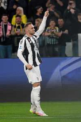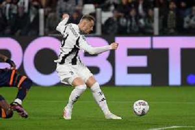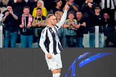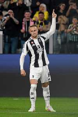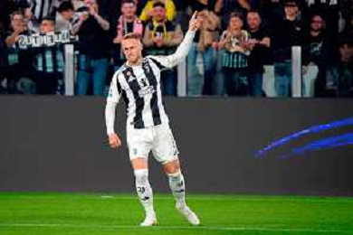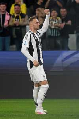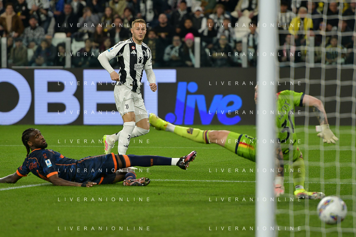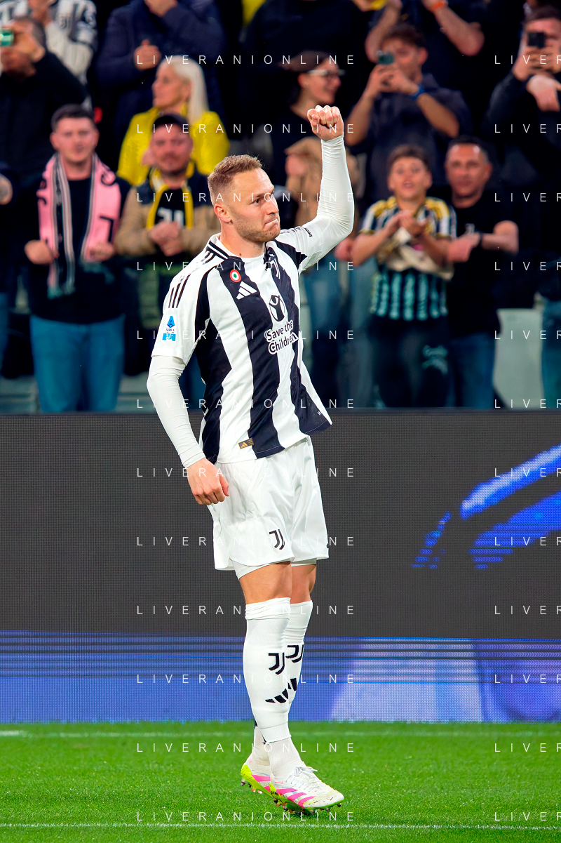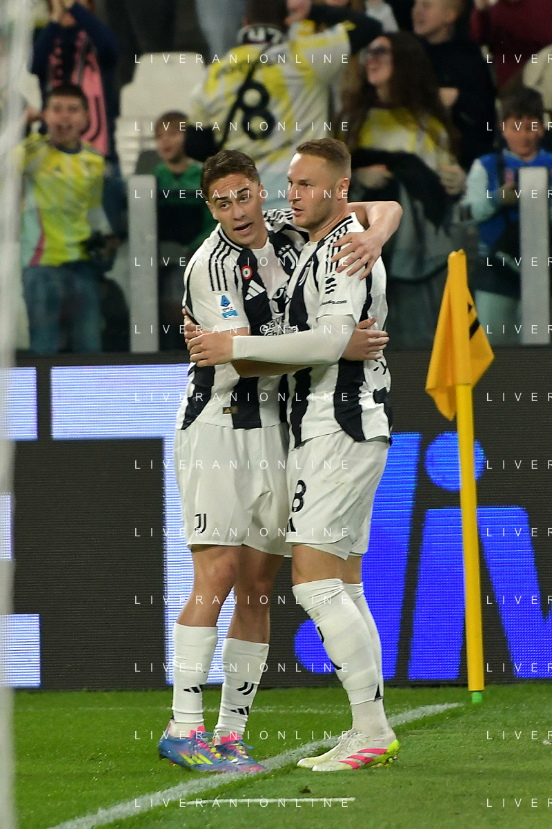 TVEM April 12, 2025 Torino, Italy - Juventus FC vs US Lecce - Italian soccer serie A 2024/25 - Allianz Stadium. In the pic: Teun Koopmeiners of Juventus celebrates after scoring a goal FOTO EMMANUELE MASTRODONATO-AG ALDO LIVERANI SAS