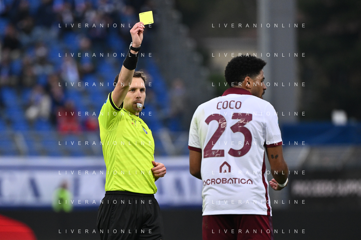 TVRG Como vs Torino nella foto l'arbitro Matteo Marcenaro di Genova ammonisce Saul Coco (Torino) Como 13-04-2025 Stadio Giuseppe Sinigaglia Campionato Serie A Enilive - 32a giornata foto Roberto Garavaglia/Agenzia Aldo Liverani sas