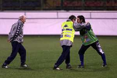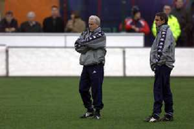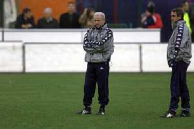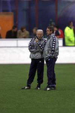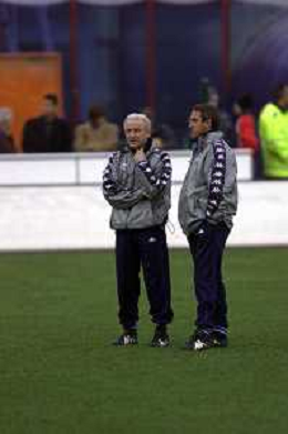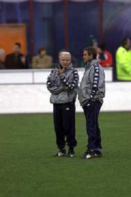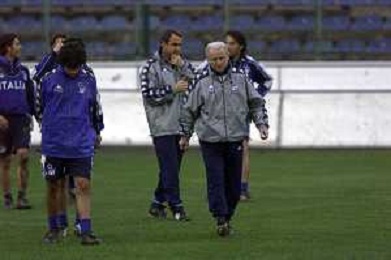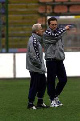 DIG- ALLENAMENTO NAZIONALE ITALIANA CALCIO A BUCAREST IN ROMANIA 23 MARZO 2001 NELLA FOTO L’ALLENATORE GIOVANNI TRAPATTONI CON PIETRO GHEDIN AGENZIA ALDO LIVERANI SAS