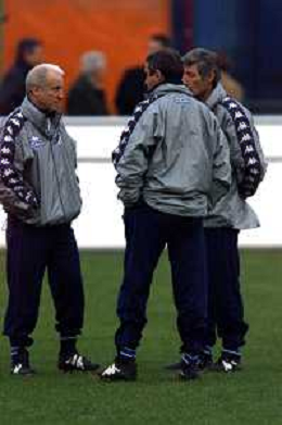 DIG- ALLENAMENTO NAZIONALE ITALIANA CALCIO A BUCAREST IN ROMANIA 23 MARZO 2001 NELLA FOTO L’ALLENATORE GIOVANNI TRAPATTONI CON PIETRO GHEDIN E ADRIANO BARDIN AGENZIA ALDO LIVERANI SAS