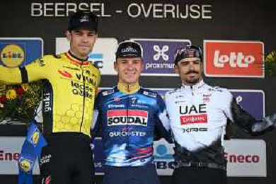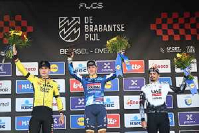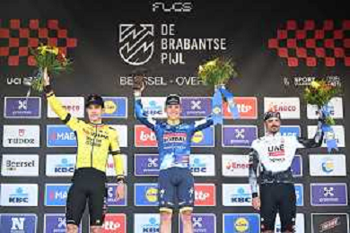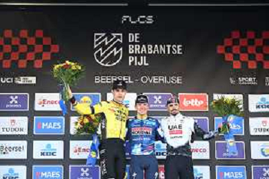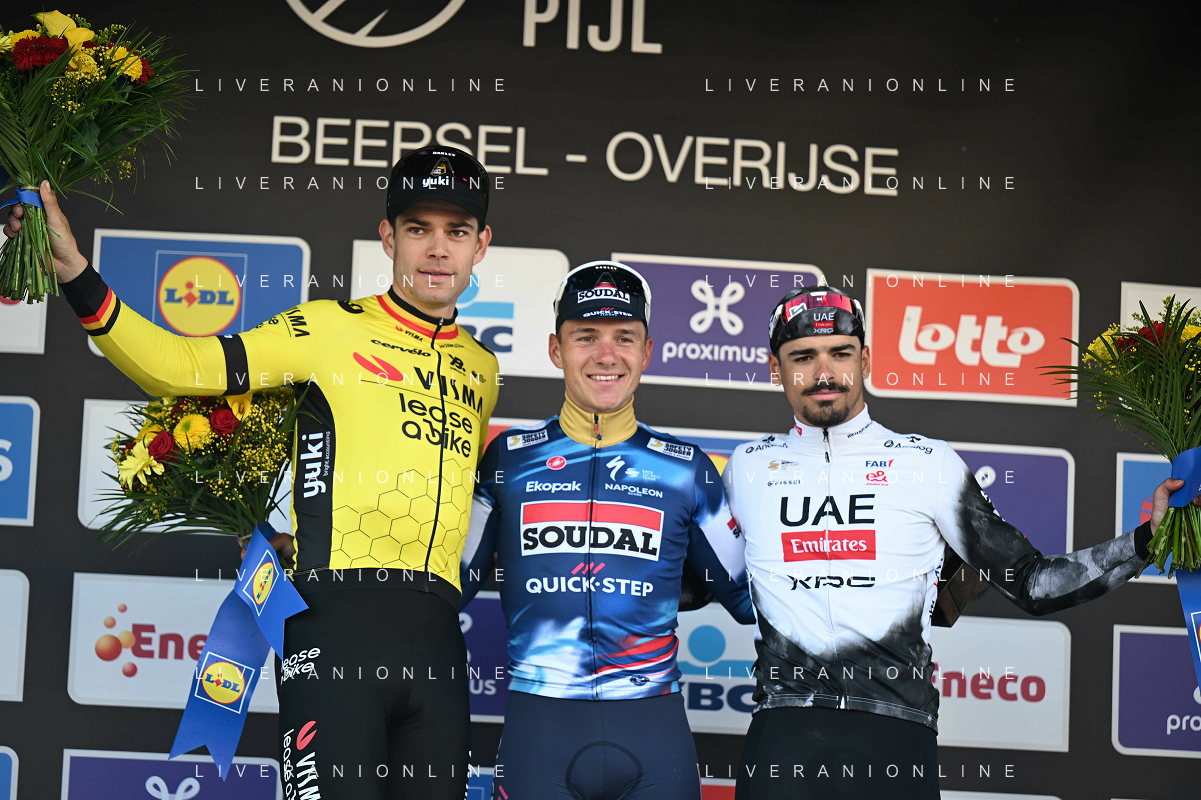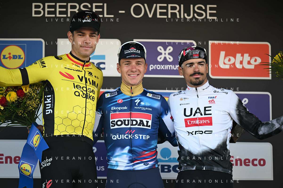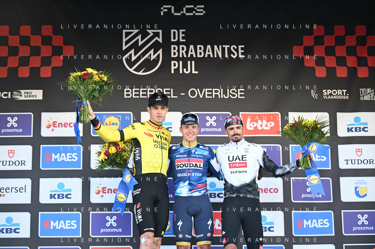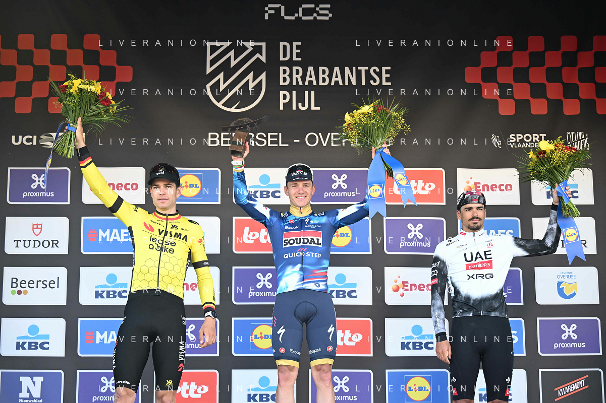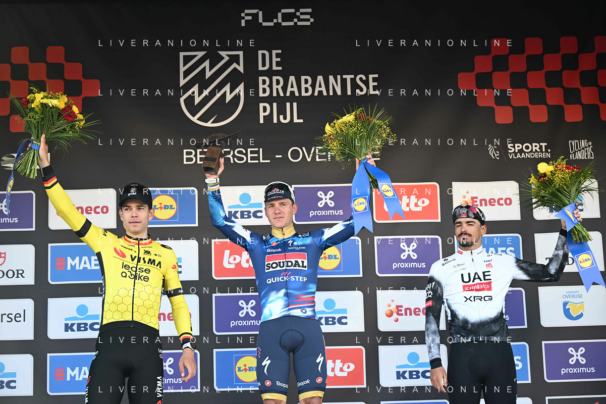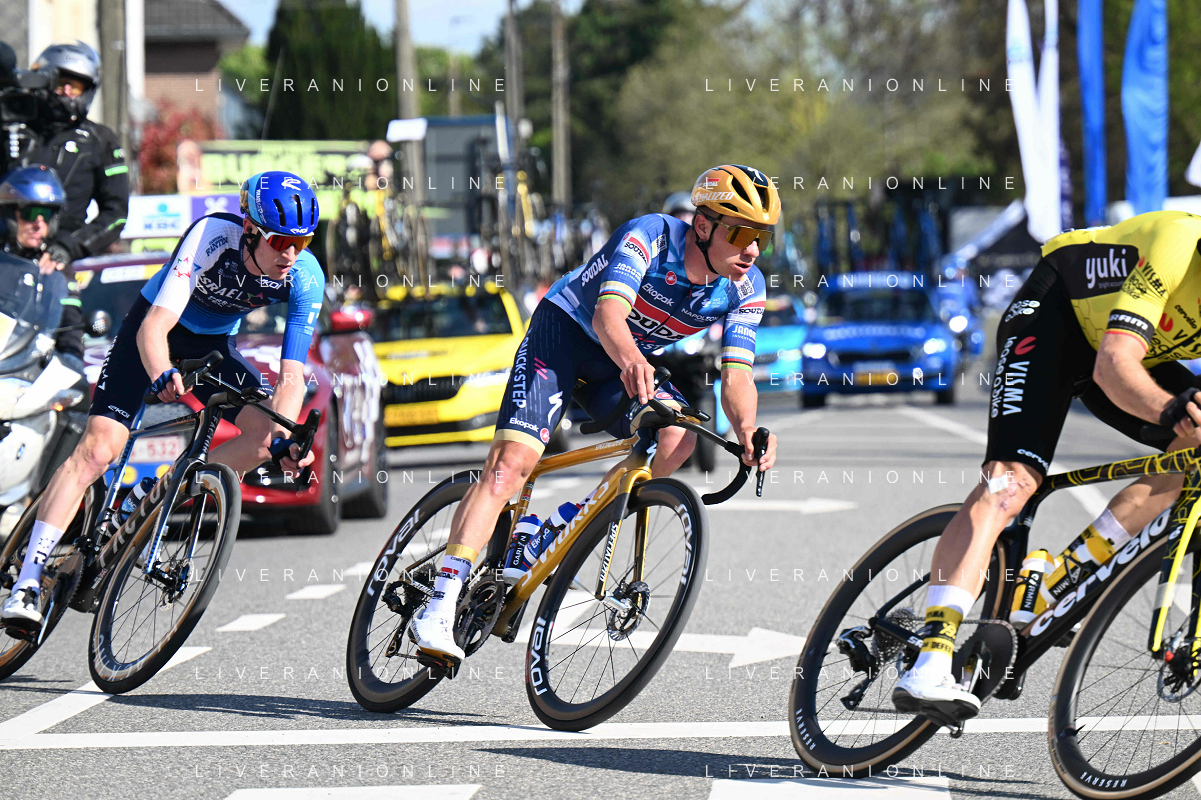 18-04-2025 Brabantse Pijl; 2025, Soudal - Quick Step; 2025, Visma - Lease A Bike; 2025, Uae Team Emirates - Xrg; Evenepoel, Remco; Van Aert, Wout; Morgado, Antonio; Overijse; ©SIROTTI - AGENZIA ALDO LIVERANI SAS