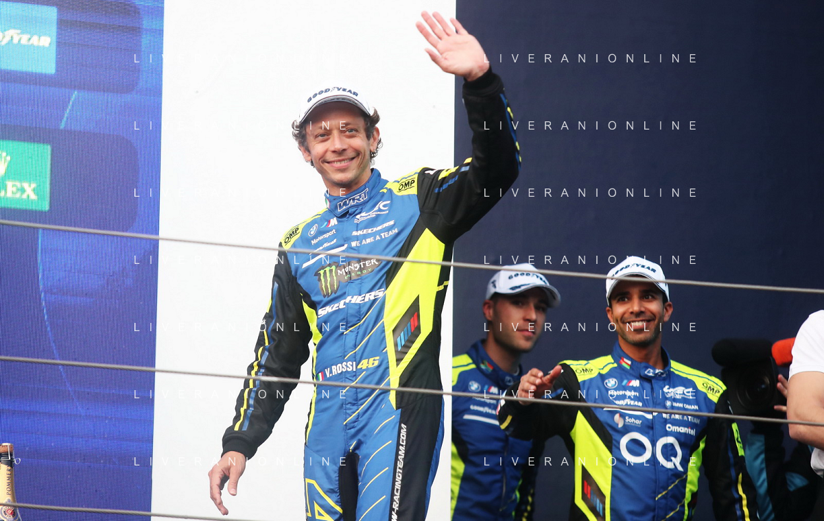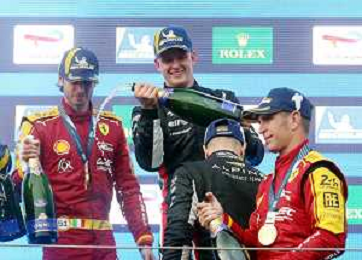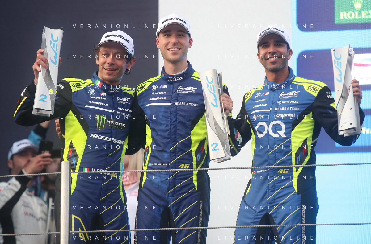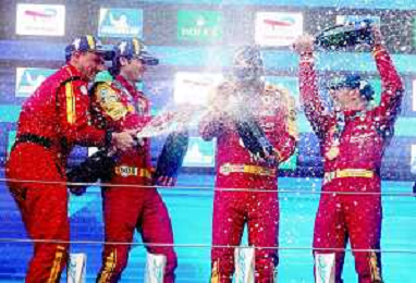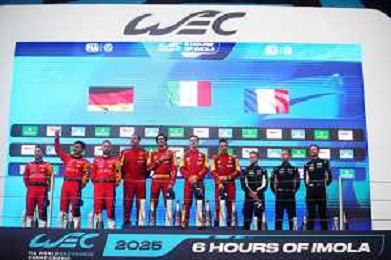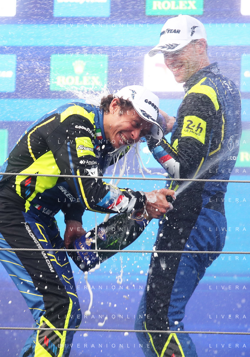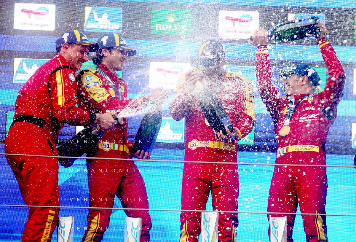 IMOLA 20 04 2025 AUTODROMO ENZO E DINO FERRARI WEC 6 ORE DI IMOLA NELLA FOTO MICK SCHUMACHER ALPINE A522 FESTEGGIA ASSIEME CON I VINCITORI ANTONIO GIOVINAZZI E PIER GUIDI FERRARI 499P FOTO GIANNI SANNA-AG ALDO LIVERANI SAS