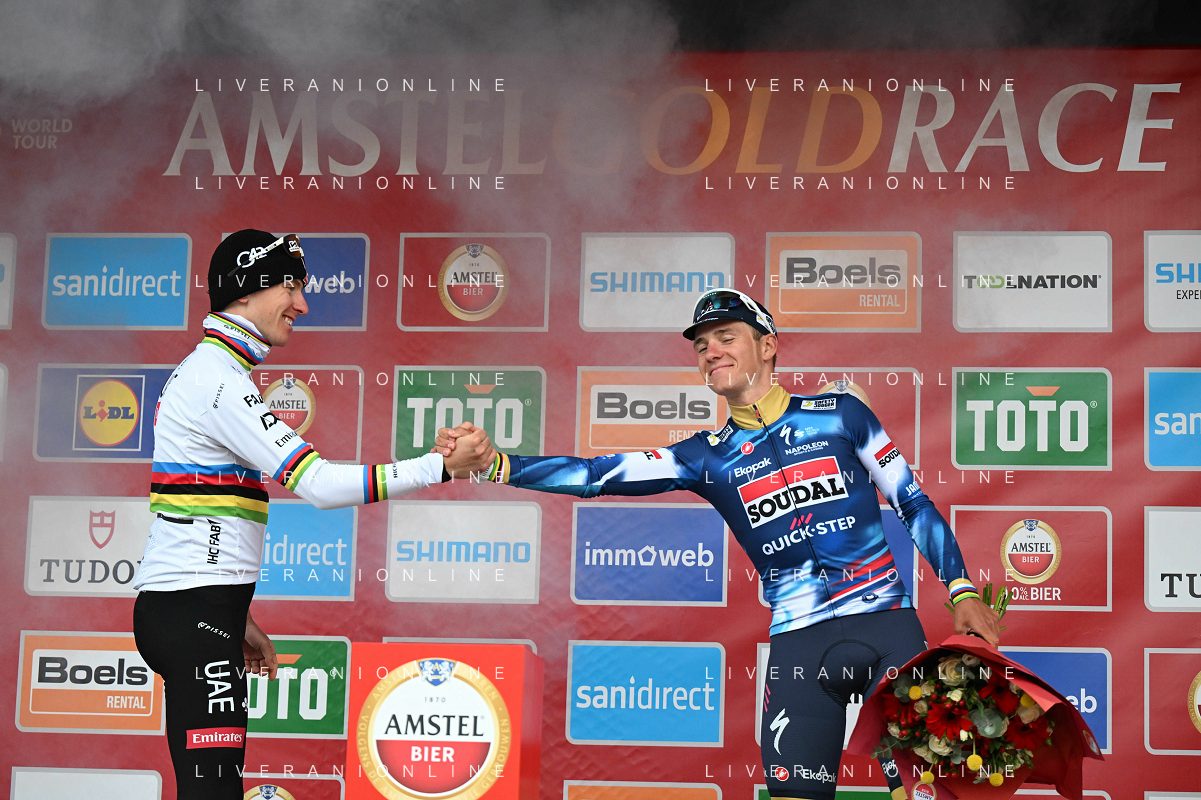 20-04-2025 Amstel Gold Race; 2025, Uae Team Emirates - Xrg; 2025, Soudal - Quick Step; Pogacar, Tadej; Evenepoel, Remco; Valkenburg; ©SIROTTI - AGENZIA ALDO LIVERANI SAS
