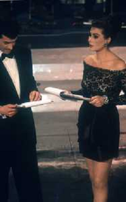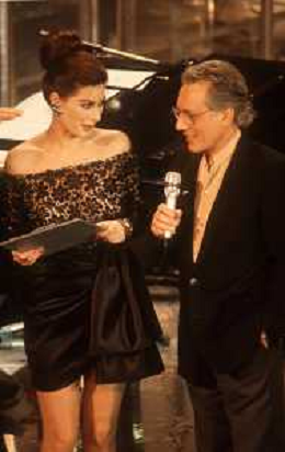 DIAP-RETROSPETTIVA EDWIGE FENECH ATTRICE NELLA FOTO EDWIGE FENECH AL FESTIVAL DI SANREMO NELL'ANNO 1991 CON UMBERTO TOZZI AG ALDO LIVERANI SAS