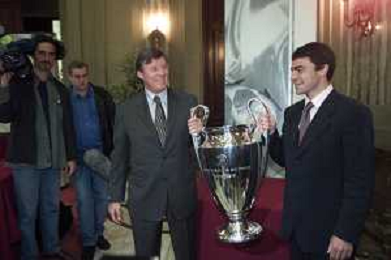 DIG- CONSEGNA DEL TROFEO PER LA FINALE DELLA COPPA DEI CAMPIONI A PALAZZO MARINO A MILANO 19 APRILE 2001 - RETROSPETTIVA NELLA FOTO MANUEL SANCHIS CON GERHARD AIGNER SEGRETARIO GENERALE DELLA UEFA AGENZIA ALDO LIVERANI SAS