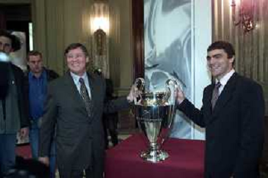 DIG- CONSEGNA DEL TROFEO PER LA FINALE DELLA COPPA DEI CAMPIONI A PALAZZO MARINO A MILANO 19 APRILE 2001 - RETROSPETTIVA NELLA FOTO IL SINDACO DI MILANO GABRIELE ALBERTINI CON MANUEL SANCHIS AGENZIA ALDO LIVERANI SAS