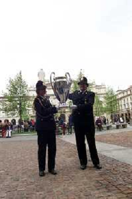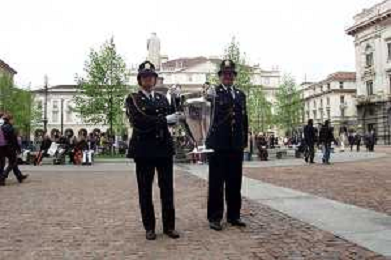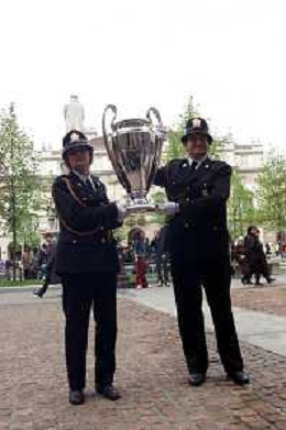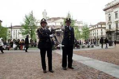 DIG- CONSEGNA DEL TROFEO PER LA FINALE DELLA COPPA DEI CAMPIONI A PALAZZO MARINO A MILANO 19 APRILE 2001 - RETROSPETTIVA NELLA FOTO DUE VIGILI URBANI NELLA PIAZZA DAVANTI PALAZZO MARINO AGENZIA ALDO LIVERANI SAS