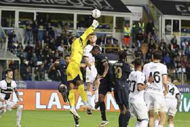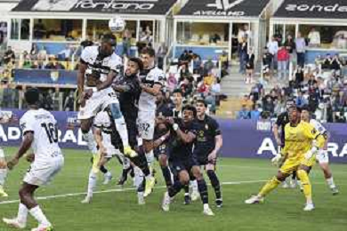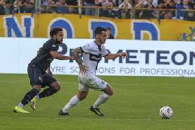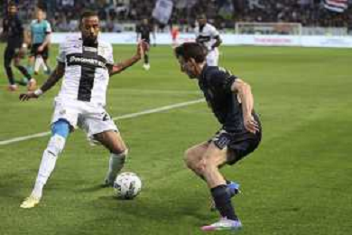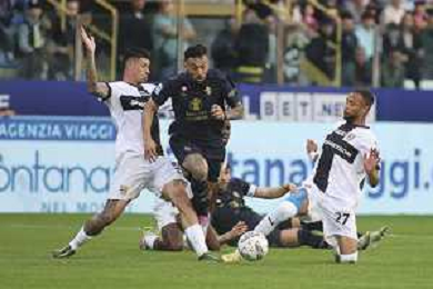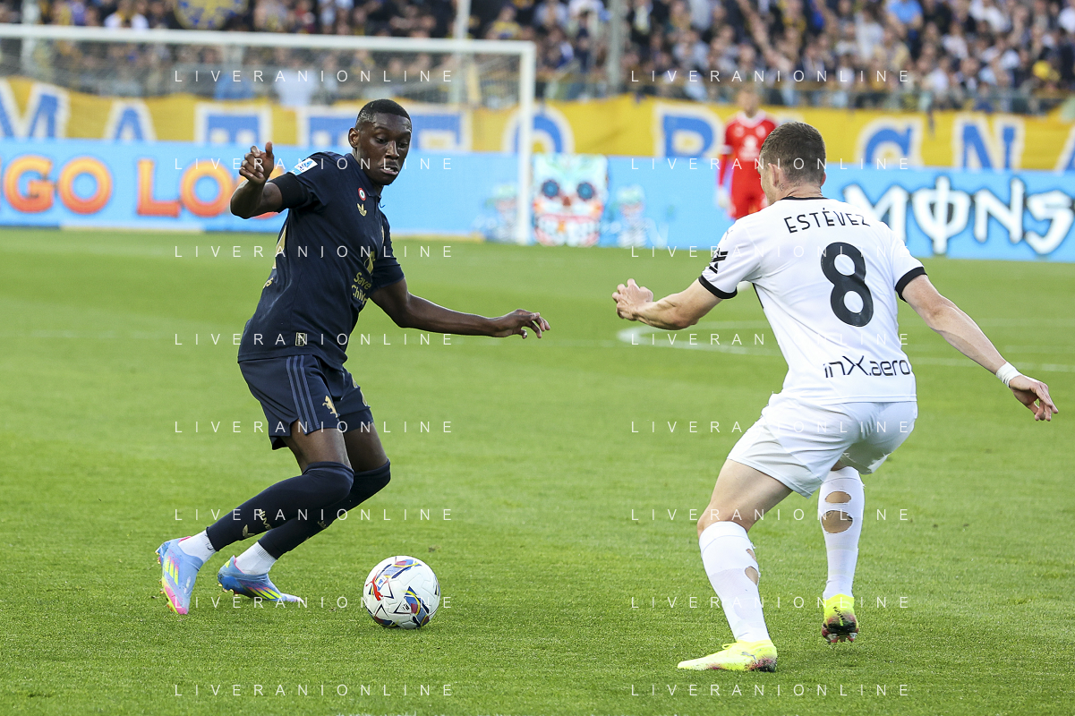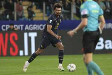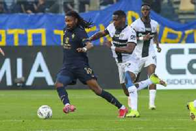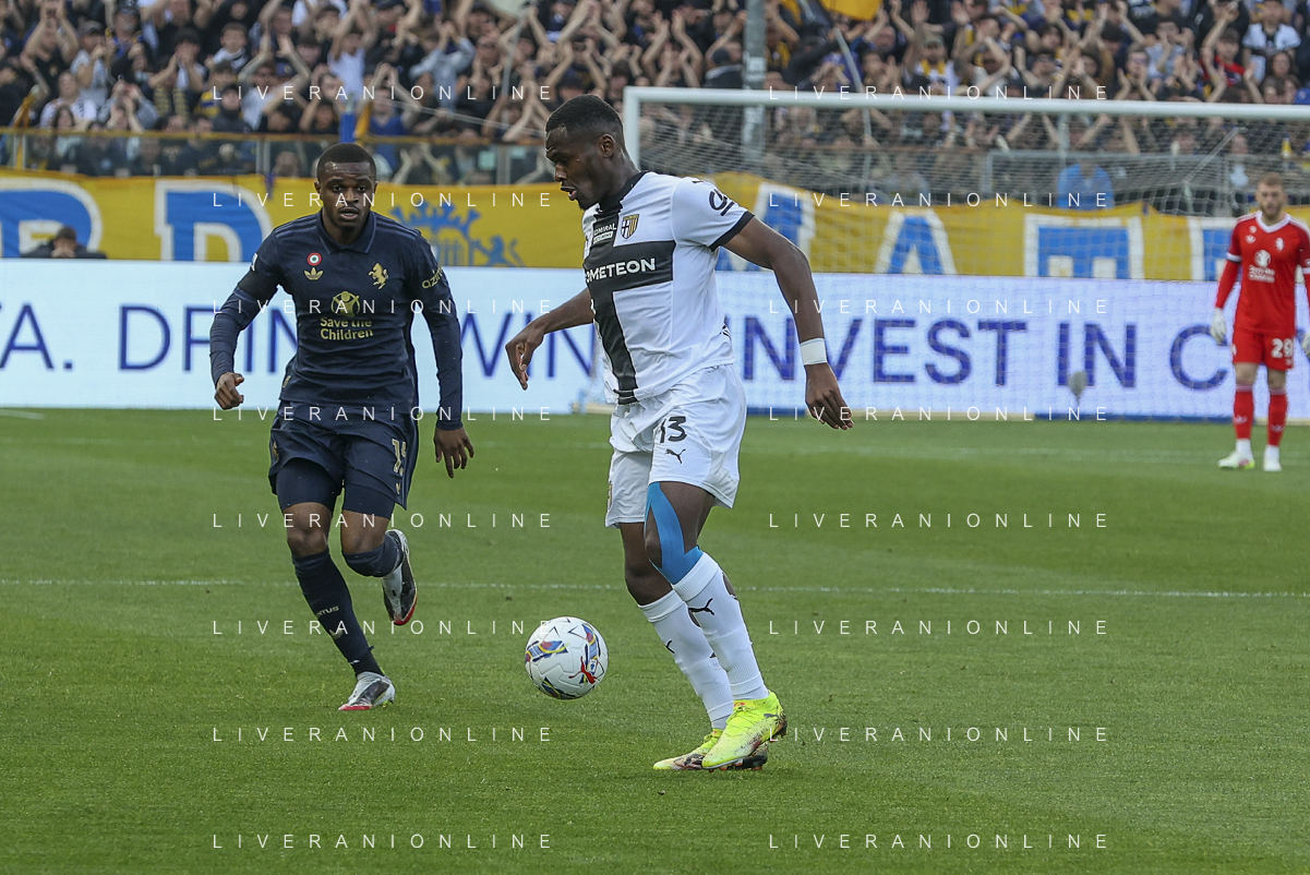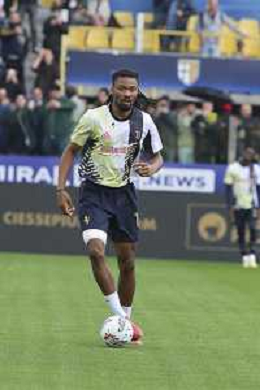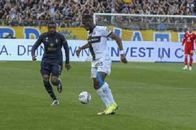 Ange-Yoan Bonny of Parma AC play the ball during Parma Calcio vs Juventus FC, 33° Serie A Enilive 2024-25 game at Ennio Tardini stadium in Parma (PR), Italy, on April 23, 2025. (Photo by Davide Casentini)- AGENZIA ALDO LIVERANI SAS