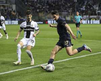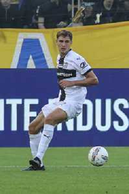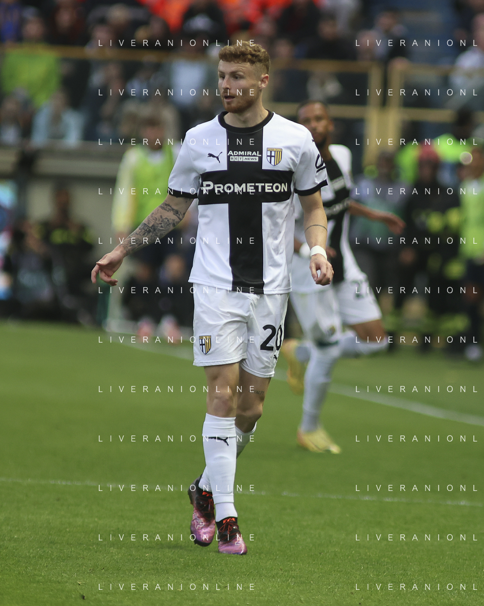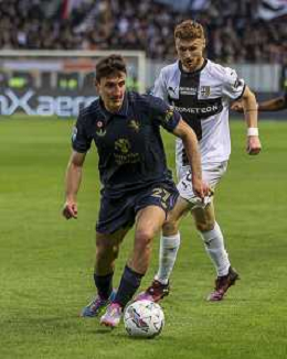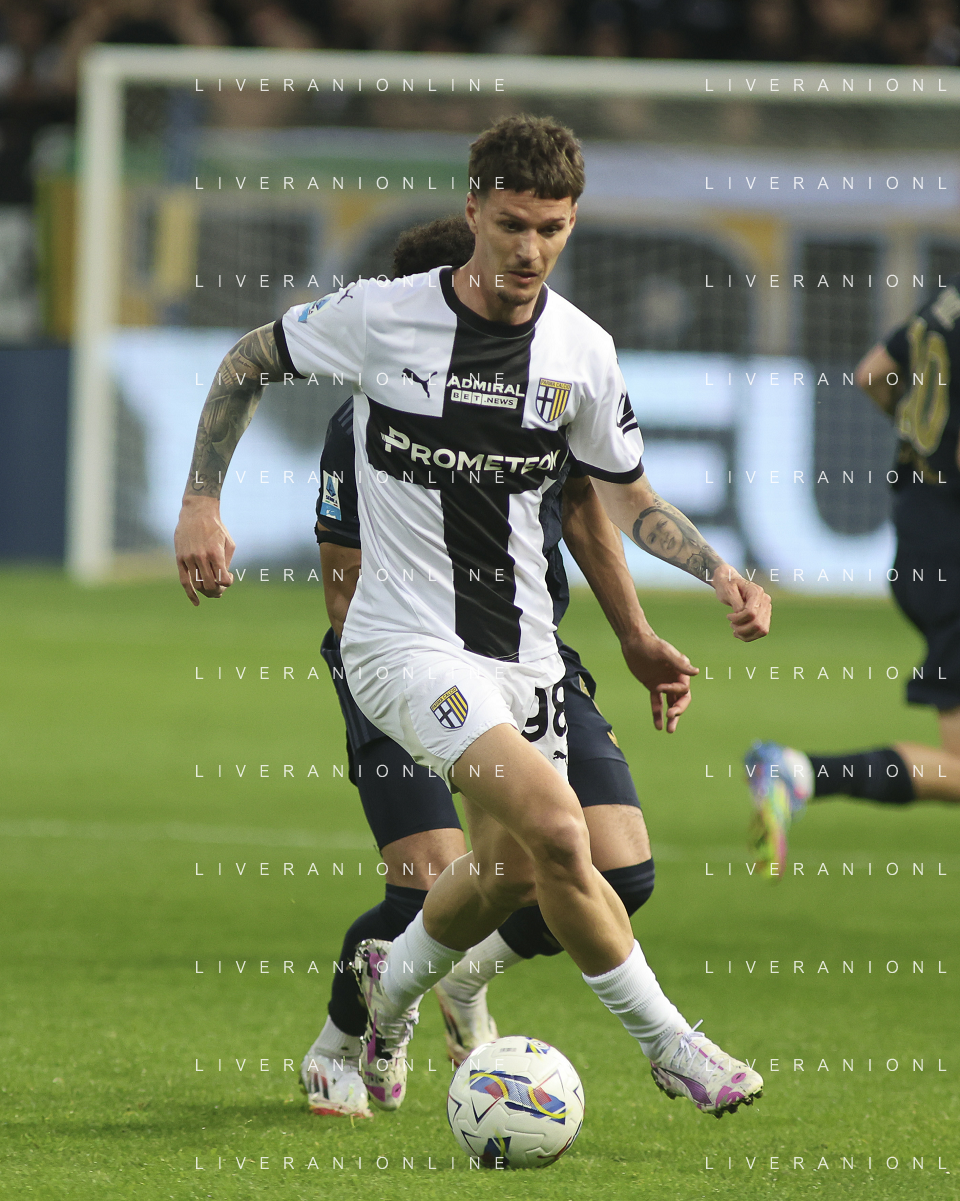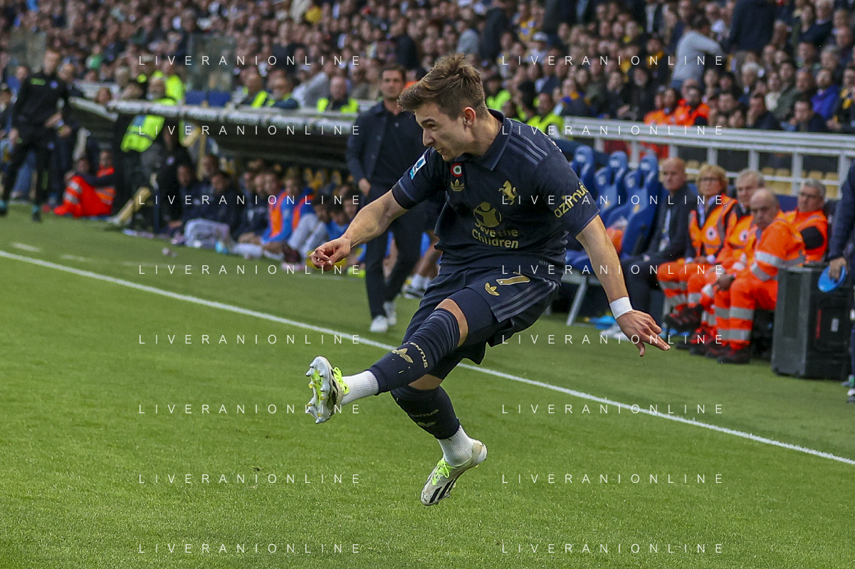 Mateo Pellegrino of Parma AC play the ball during Parma Calcio vs Juventus FC, 33° Serie A Enilive 2024-25 game at Ennio Tardini stadium in Parma (PR), Italy, on April 23, 2025. (Photo by Davide Casentini)- AGENZIA ALDO LIVERANI SAS