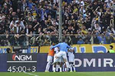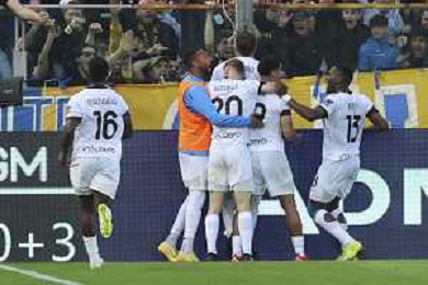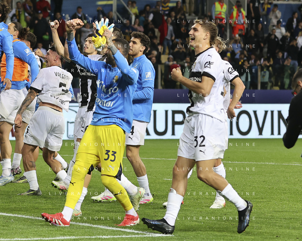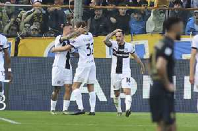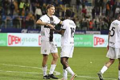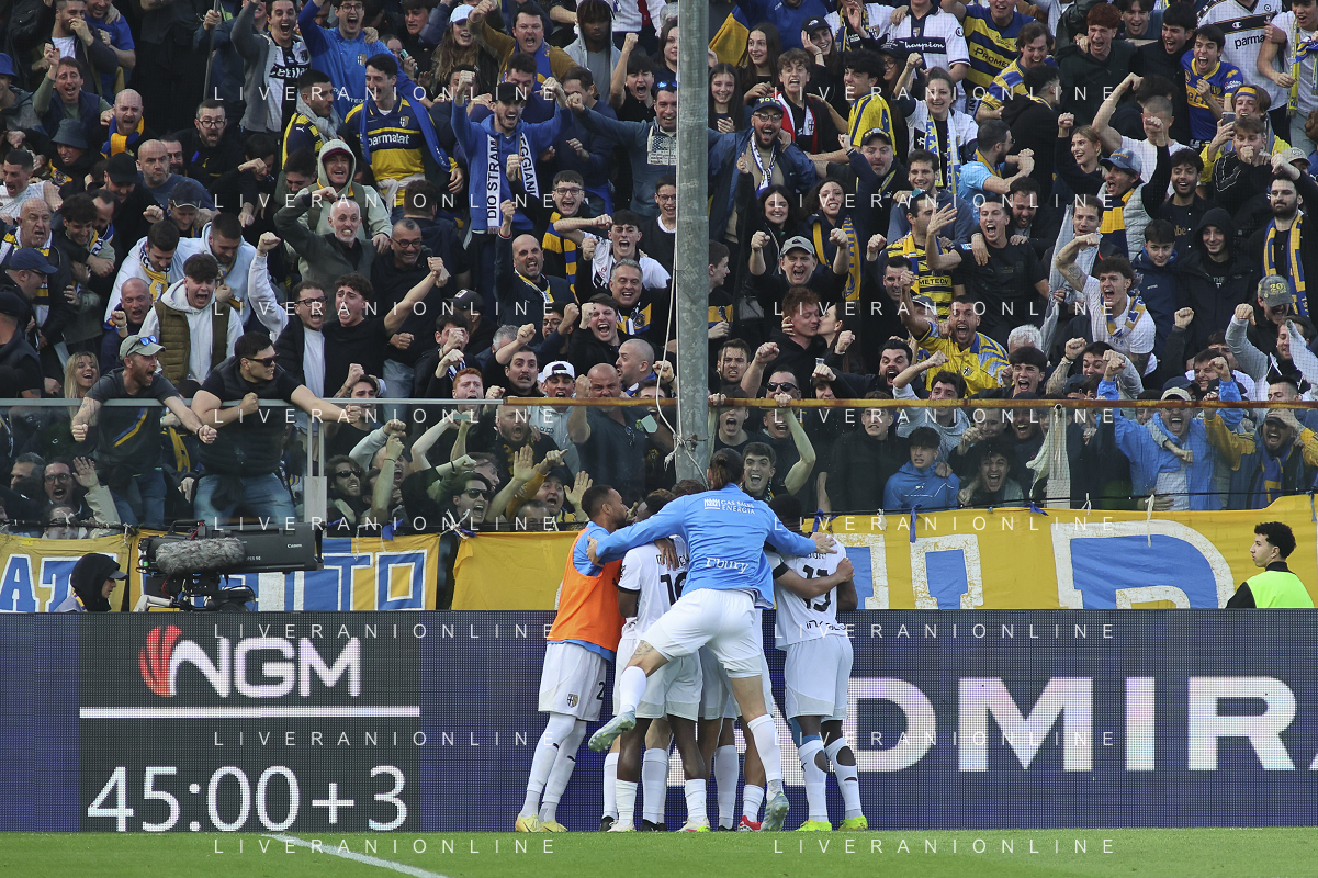 Parma players celebrate the victory during Parma Calcio vs Juventus FC, 33° Serie A Enilive 2024-25 game at Ennio Tardini stadium in Parma (PR), Italy, on April 23, 2025. (Photo by Davide Casentini)- AGENZIA ALDO LIVERANI SAS
