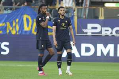 Mateo Pellegrino of Parma AC and Mandela Keita of Parma AC celebrate the victory at the end of Parma Calcio vs Juventus FC, 33° Serie A Enilive 2024-25 game at Ennio Tardini stadium in Parma (PR), Italy, on April 23, 2025. (Photo by Davide Casentini)- AGENZIA ALDO LIVERANI SAS