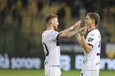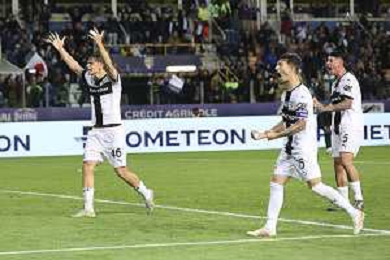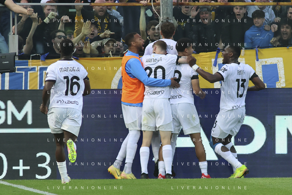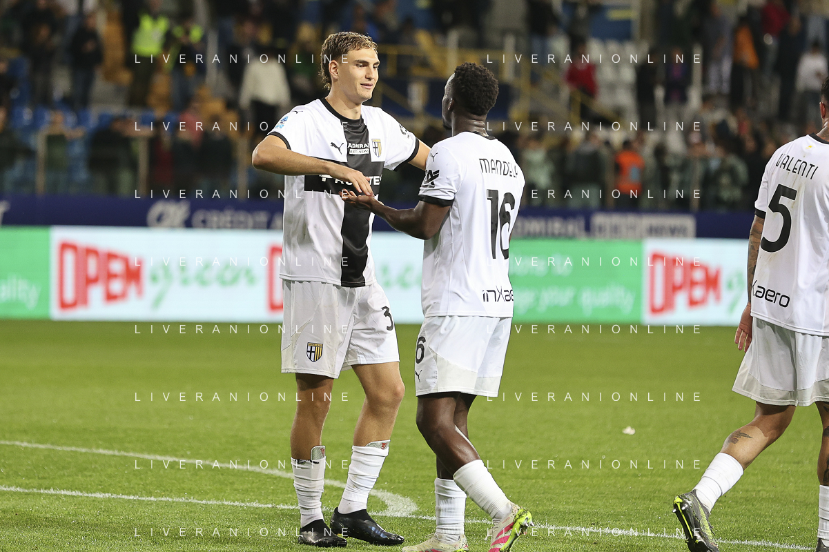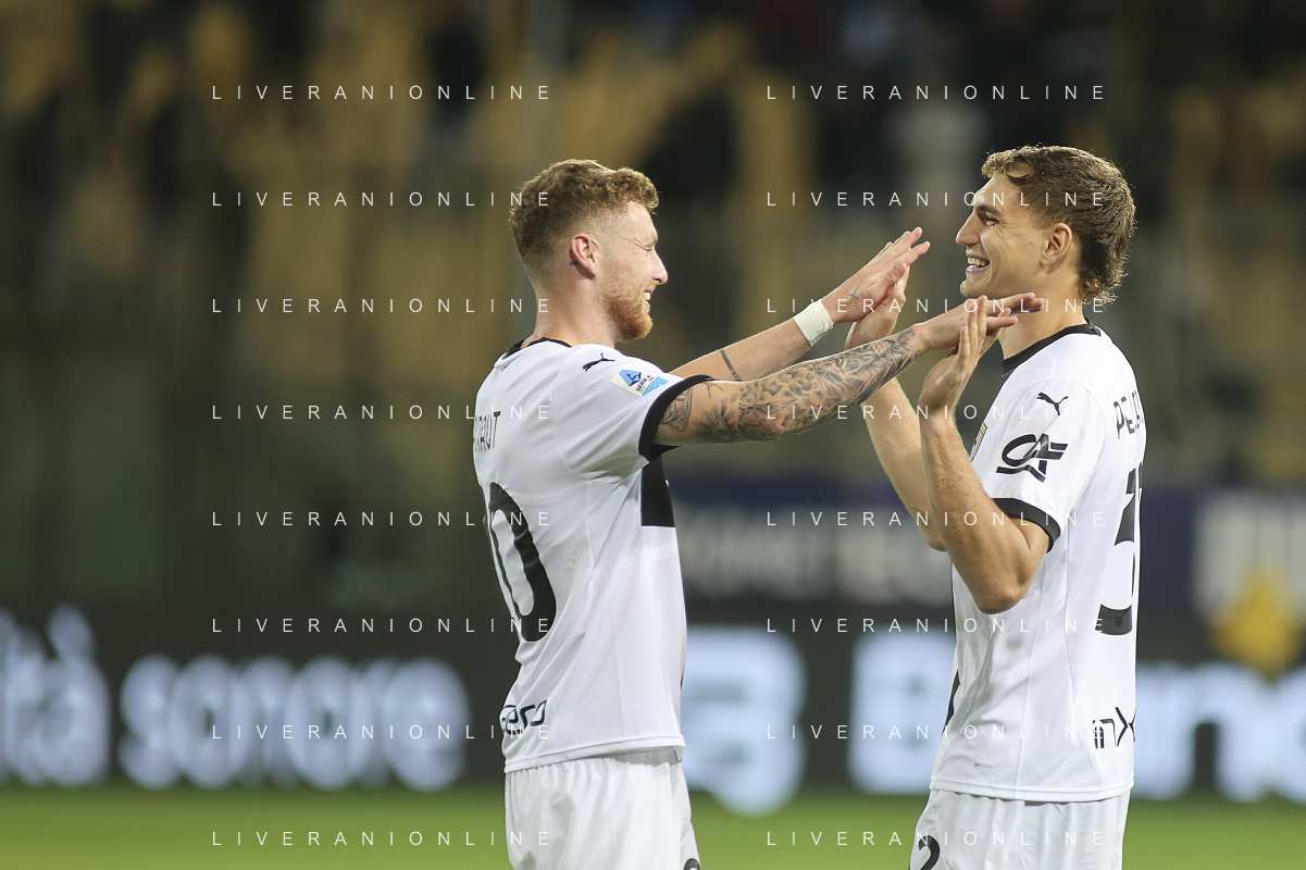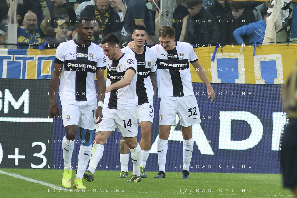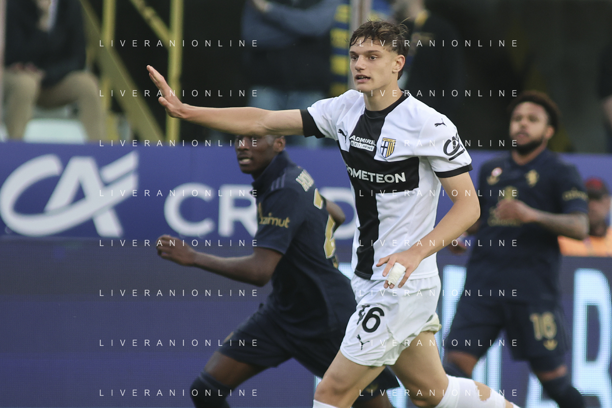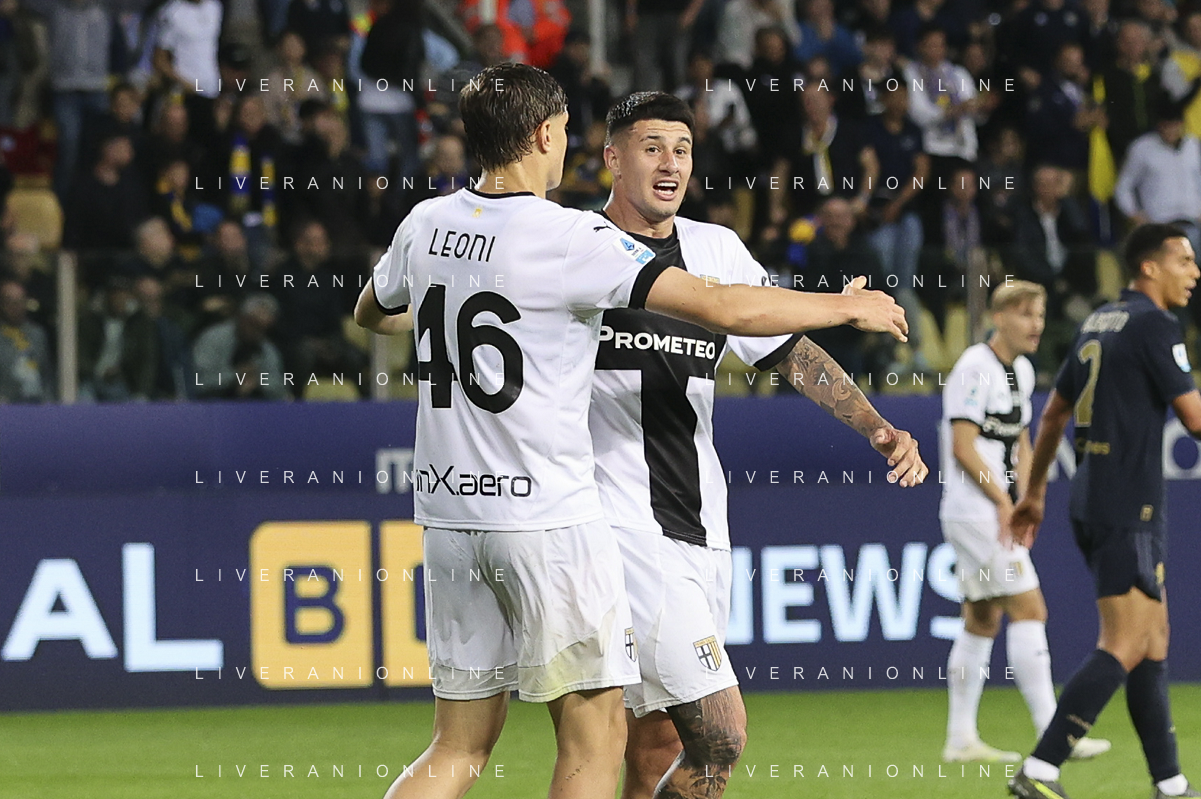 Mateo Pellegrino of Parma AC celebrates with team goal during Parma Calcio vs Juventus FC, 33° Serie A Enilive 2024-25 game at Ennio Tardini stadium in Parma (PR), Italy, on April 23, 2025. (Photo by Davide Casentini)- AGENZIA ALDO LIVERANI SAS