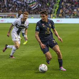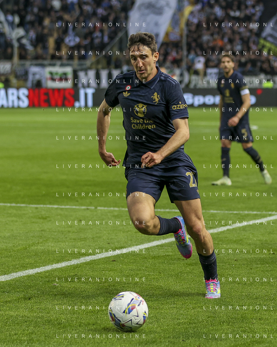 Andrea Cambiaso of Juventus FC play the ball during Parma Calcio vs Juventus FC, 33° Serie A Enilive 2024-25 game at Ennio Tardini stadium in Parma (PR), Italy, on April 23, 2025. (Photo by Davide Casentini)- AGENZIA ALDO LIVERANI SAS