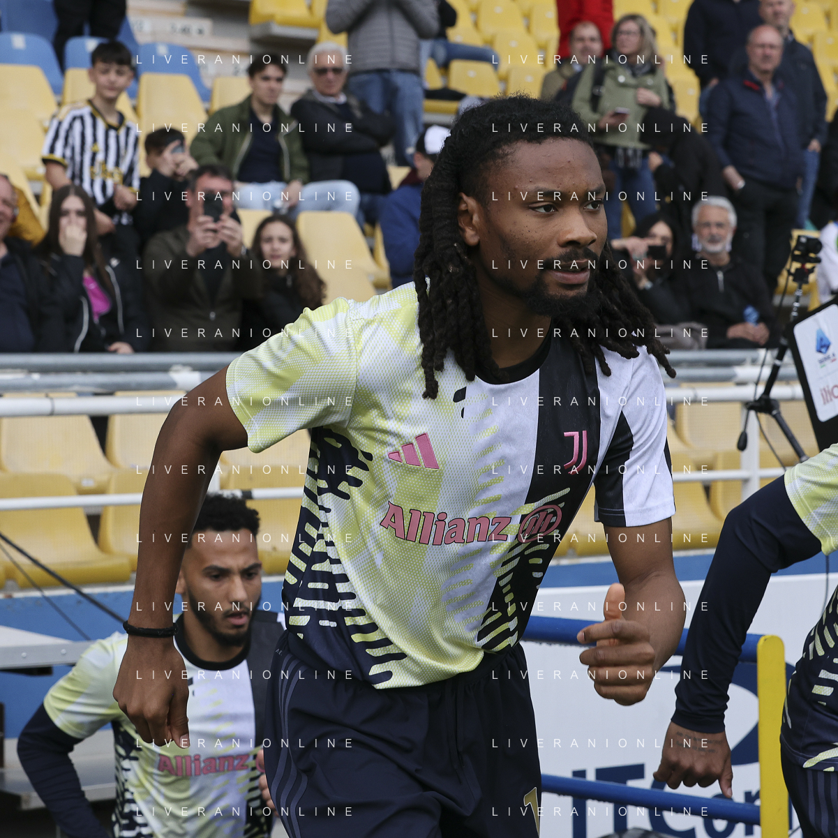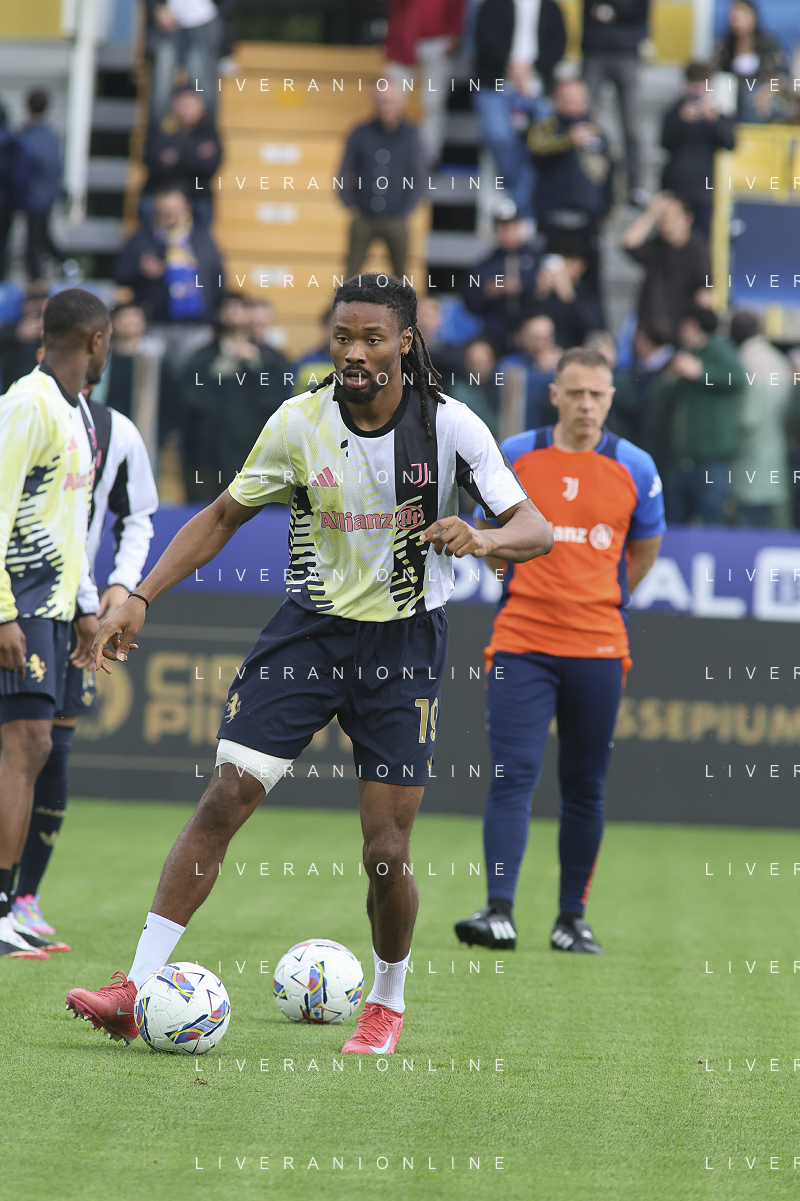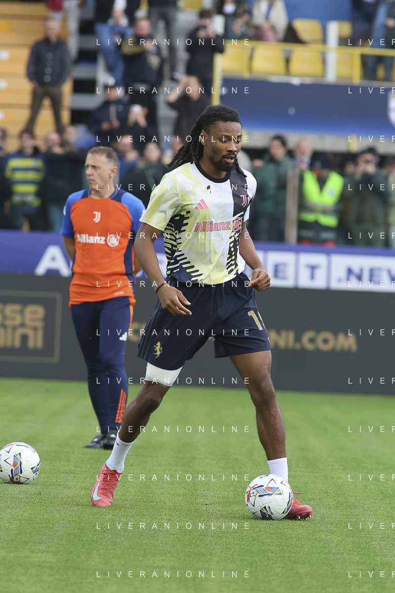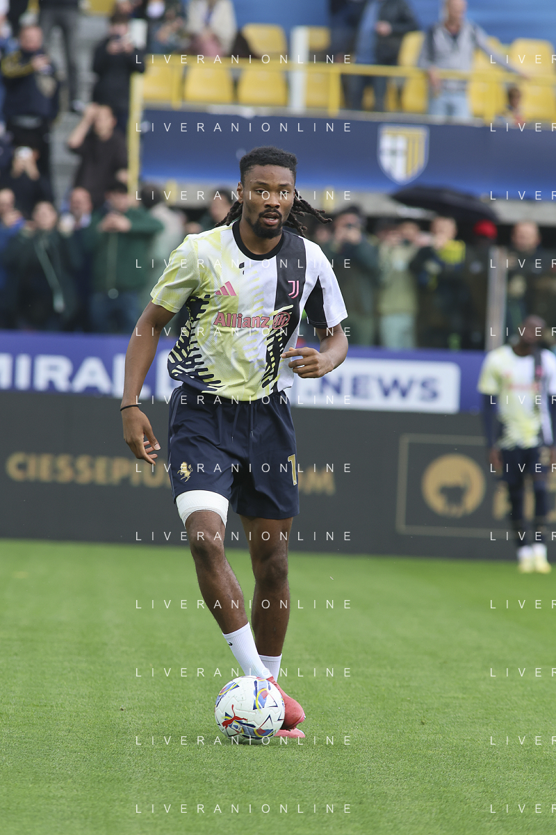 Khephren Thuram of Juventus FC play the ball during warms up before Parma Calcio vs Juventus FC, 33° Serie A Enilive 2024-25 game at Ennio Tardini stadium in Parma (PR), Italy, on April 23, 2025. (Photo by Davide Casentini)- AGENZIA ALDO LIVERANI SAS