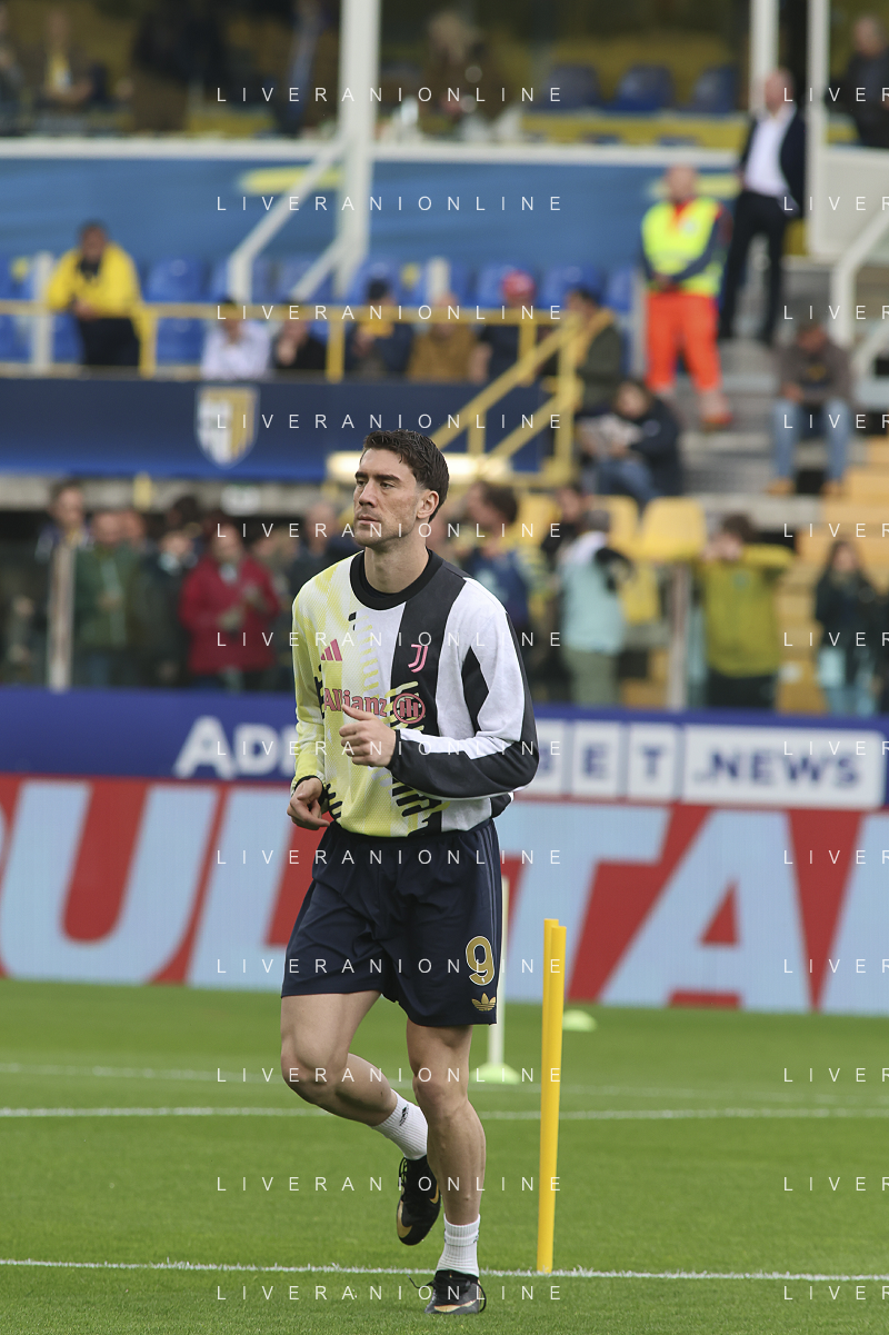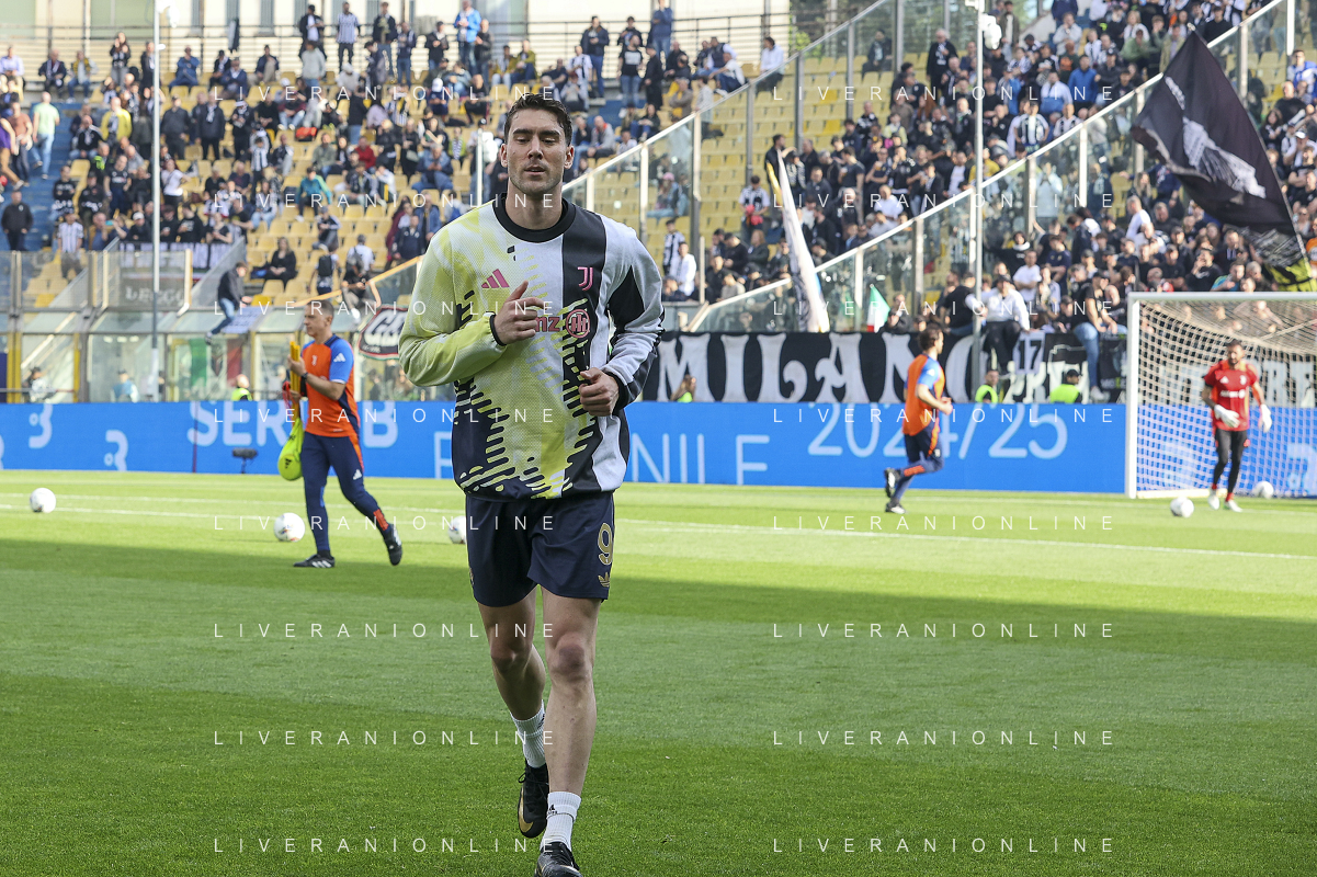 Dusan Vlahovic of Juventus FC during warms up before Parma Calcio vs Juventus FC, 33° Serie A Enilive 2024-25 game at Ennio Tardini stadium in Parma (PR), Italy, on April 23, 2025. (Photo by Davide Casentini)- AGENZIA ALDO LIVERANI SAS