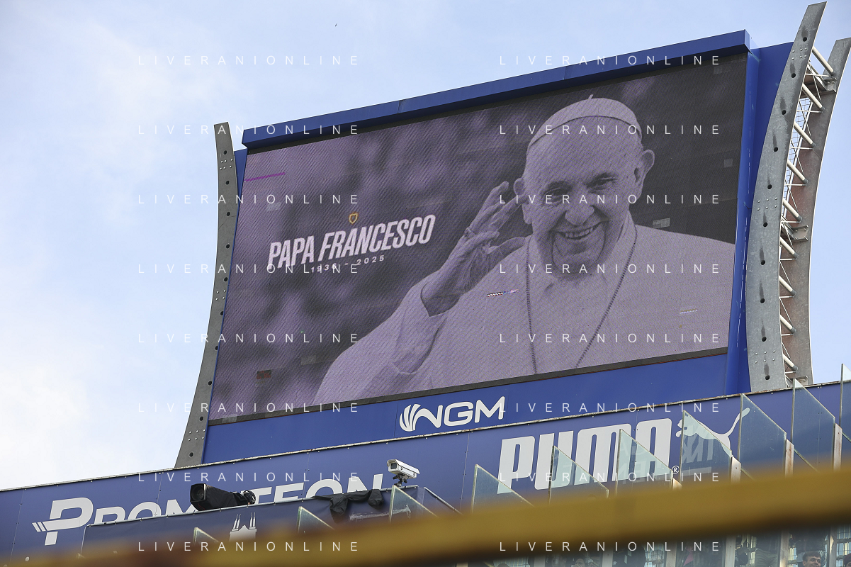 In memory of Pope Francesco during Parma Calcio vs Juventus FC, 33° Serie A Enilive 2024-25 game at Ennio Tardini stadium in Parma (PR), Italy, on April 23, 2025. (Photo by Davide Casentini)- AGENZIA ALDO LIVERANI SAS