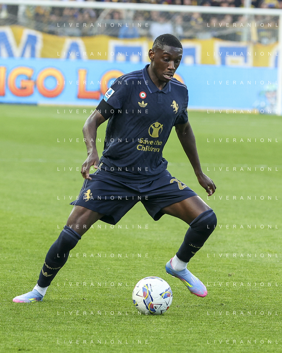 Pierre Kalulu of Juventus FC play the ball during Parma Calcio vs Juventus FC, 33° Serie A Enilive 2024-25 game at Ennio Tardini stadium in Parma (PR), Italy, on April 23, 2025. (Photo by Davide Casentini)- AGENZIA ALDO LIVERANI SAS