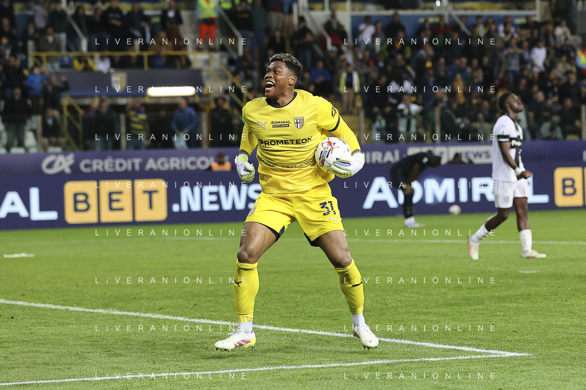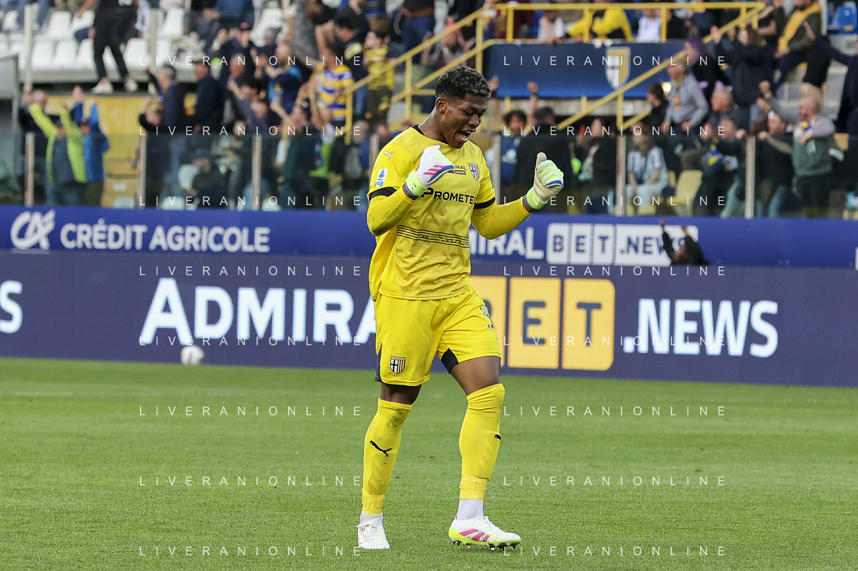 Zion Suzuki of Parma AC celebrate the victory at the end of Parma Calcio vs Juventus FC, 33° Serie A Enilive 2024-25 game at Ennio Tardini stadium in Parma (PR), Italy, on April 23, 2025. (Photo by Davide Casentini)- AGENZIA ALDO LIVERANI SAS
