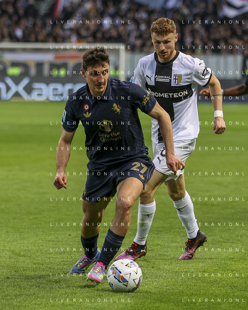 Andrea Cambiaso of Juventus FC competes for the ball with Enrico Delprato of Parma AC during Parma Calcio vs Juventus FC, 33° Serie A Enilive 2024-25 game at Ennio Tardini stadium in Parma (PR), Italy, on April 23, 2025. (Photo by Davide Casentini)- AGENZIA ALDO LIVERANI SAS
