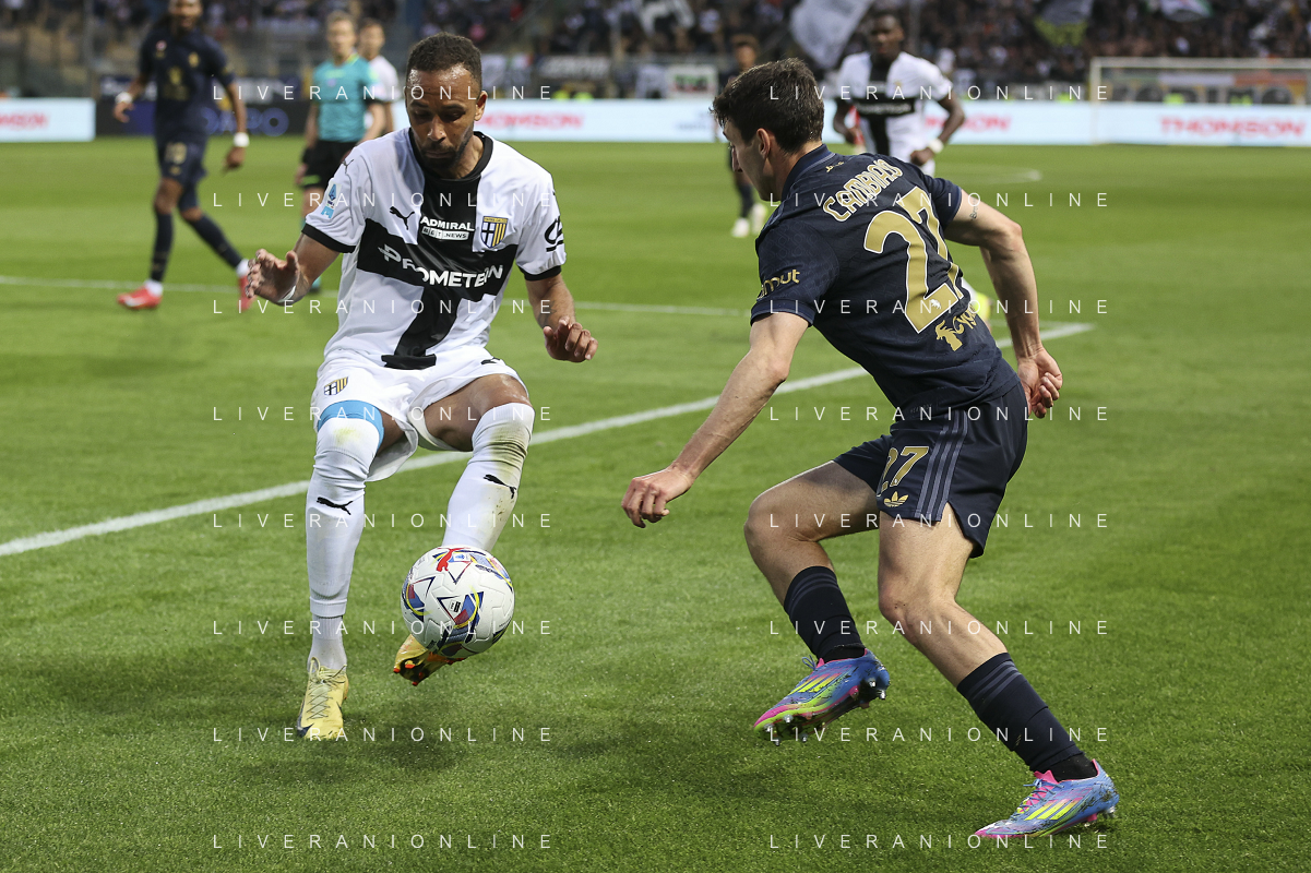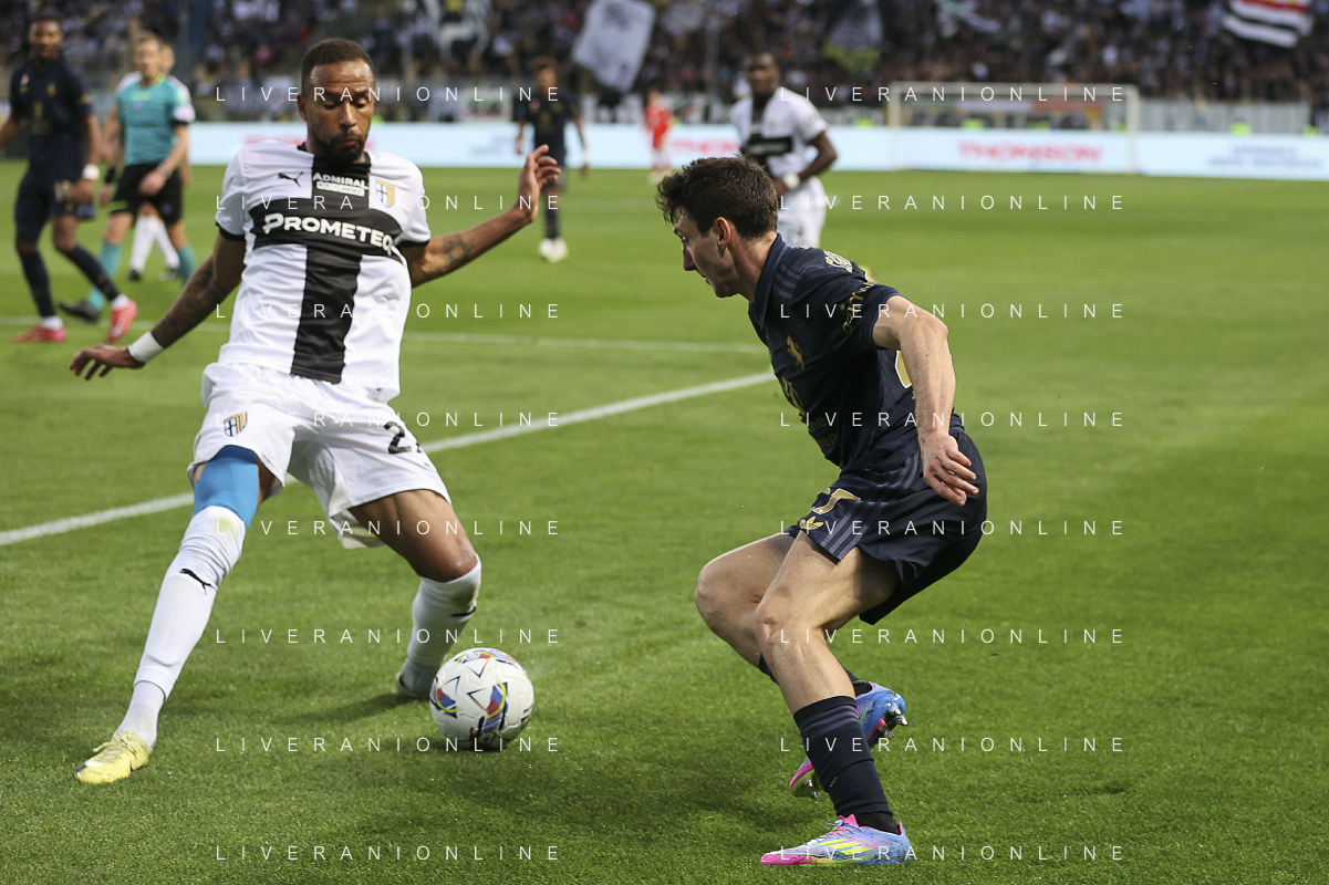 Andrea Cambiaso of Juventus FC competes for the ball with Azevedo Junior Hernani of Parma AC during Parma Calcio vs Juventus FC, 33° Serie A Enilive 2024-25 game at Ennio Tardini stadium in Parma (PR), Italy, on April 23, 2025. (Photo by Davide Casentini)- AGENZIA ALDO LIVERANI SAS