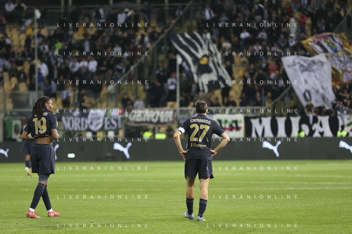 Khephren Thuram of Juventus FC and Andrea Cambiaso of Juventus FC expresses disappointment at the end of Parma Calcio vs Juventus FC, 33° Serie A Enilive 2024-25 game at Ennio Tardini stadium in Parma (PR), Italy, on April 23, 2025. (Photo by Davide Casentini)- AGENZIA ALDO LIVERANI SAS