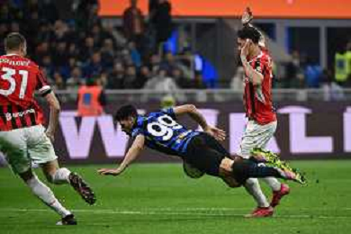 Coppa Italia Frecciarossa 2024-2025 Milano 23 Aprile 2025 (Stadio Giuseppe Meazza) Nella foto Nicolo’ Barella e Rafael Leao ©ANDREA ROSITO -AGENZIA ALDO LIVERANI SAS -INTER - MILAN Coppa Italia Frecciarossa semifinale gara di ritorno 23.04.2025