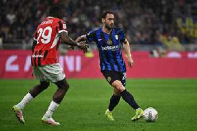 Inter vs Milan nella foto Hakan Calhanoglu (Inter) contrastato da Youssouf Fofana (Milan) a SX Milano 23-04-2025 Stadio Giuseppe Meazza - San Siro Coppa Italia Frecciarossa - semifinale gara di ritorno foto Roberto Garavaglia/Agenzia Aldo Liverani sas- AGENZIA ALDO LIVERANI SAS