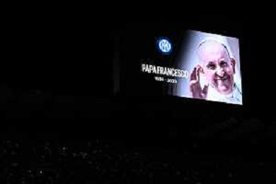 Coppa Italia Frecciarossa 2024-2025 Milano 23 Aprile 2025 (Stadio Giuseppe Meazza) Nella foto il ricordo di Papa Francesco ©ANDREA ROSITO -AGENZIA ALDO LIVERANI SAS -INTER - MILAN Coppa Italia Frecciarossa semifinale gara di ritorno 23.04.2025