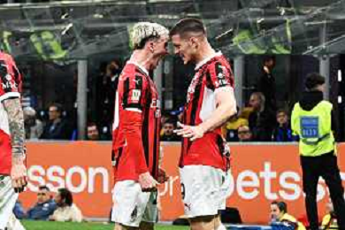 Coppa Italia Frecciarossa 2024-2025 Milano 23 Aprile 2025 (Stadio Giuseppe Meazza) Nella foto Festa gol 2-0 Milan ©ANDREA ROSITO -AGENZIA ALDO LIVERANI SAS -INTER - MILAN Coppa Italia Frecciarossa semifinale gara di ritorno 23.04.2025
