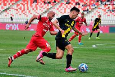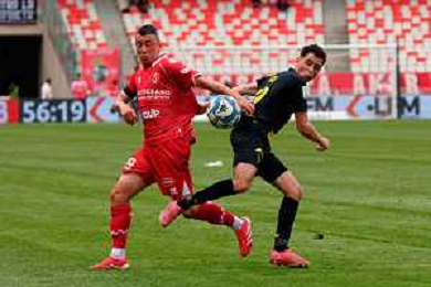 TVEM April 25, 2025 Bari, Italy - SSC Bari vs Modena FC 1912 - Italian soccer serie B 2024/25 - San Nicola Stadium. In the pic: Cesar Falletti of SSC Bari in action against Giuseppe Caso of Modena FC 1912 ©TVEM Emmanuele Mastrodonato - AGENZIA ALDO LIVERANI SAS