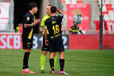 TVEM April 25, 2025 Bari, Italy - SSC Bari vs Modena FC 1912 - Italian soccer serie B 2024/25 - San Nicola Stadium. In the pic: Alessandro Di Pardo of Modena FC 1912 Players of protests with the referee Gianluca Aureliano of Bologna ©TVEM Emmanuele Mastrodonato - AGENZIA ALDO LIVERANI SAS