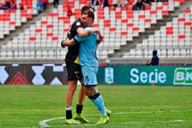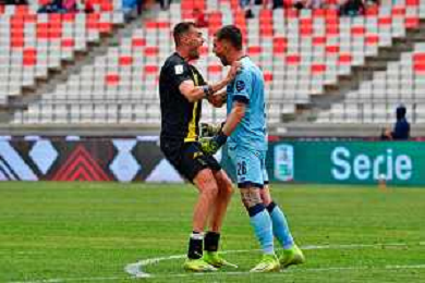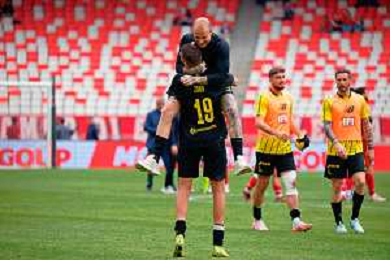 TVEM April 25, 2025 Bari, Italy - SSC Bari vs Modena FC 1912 - Italian soccer serie B 2024/25 - San Nicola Stadium. In the pic: Giovanni Zaro of Modena FC 1912 and Riccardo Gagno of Modena FC 1912 celebrates the victory ©TVEM Emmanuele Mastrodonato - AGENZIA ALDO LIVERANI SAS