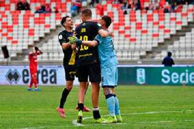 TVEM April 25, 2025 Bari, Italy - SSC Bari vs Modena FC 1912 - Italian soccer serie B 2024/25 - San Nicola Stadium. In the pic: Riccardo Gagno of Modena FC 1912 and Antonio Palumbo of Modena FC 1912 celebrates the victory ©TVEM Emmanuele Mastrodonato - AGENZIA ALDO LIVERANI SAS