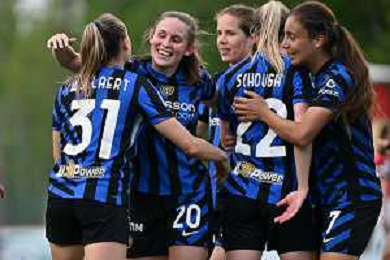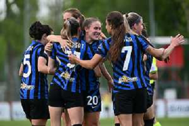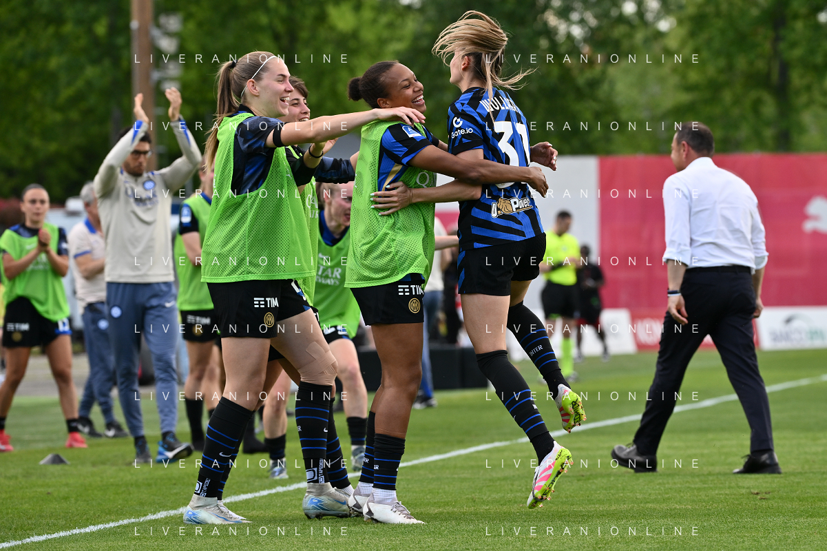 TVRG Milan vs Inter nella foto giocatrici Inter esultanza dopo il gol del 3 a 1 Milano 25-04-2025 Centro Sportivo Peppino Vismara Campionato Serie A Femminile eBay - 8a giornata Poule Scudetto foto Roberto Garavaglia/Agenzia Aldo Liverani sas