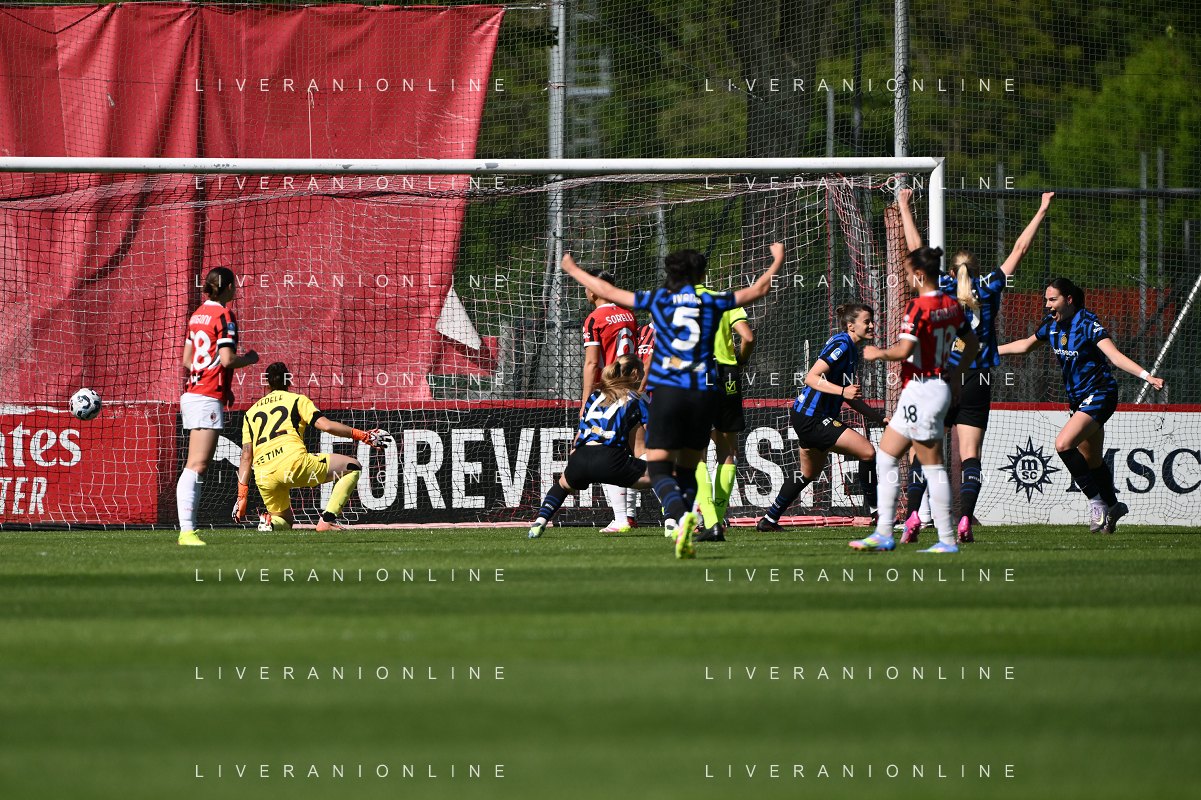 TVRG Milan vs Inter nella foto Elisa Polli (Inter) segna il gol del 2 a 1 Milano 25-04-2025 Centro Sportivo Peppino Vismara Campionato Serie A Femminile eBay - 8a giornata Poule Scudetto foto Roberto Garavaglia/Agenzia Aldo Liverani sas