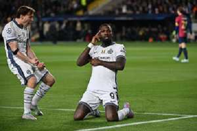 TVRG Barcellona vs Inter nella foto Denzel Dumfries (Inter) esultanza dopo il gol del 3 a 2 Barcellona (SPA) 30-04-2025 Stadio Olimpico - Lluis Companys UEFA Champions League - semifinali gara di adata foto Roberto Garavaglia/Agenzia Aldo Liverani sas - AGENZIA ALDO LIVERANI SAS