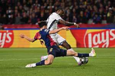 TVRG Barcellona vs Inter nella foto Denzel Dumfries (Inter) e Raphinha Raphael Dias Belloli (Barcellona) Barcellona (SPA) 30-04-2025 Stadio Olimpico - Lluis Companys UEFA Champions League - semifinali gara di adata foto Roberto Garavaglia/Agenzia Aldo Liverani sas - AGENZIA ALDO LIVERANI SAS