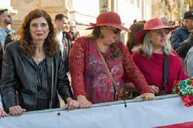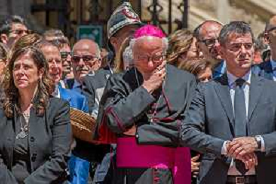 1-5-2025. Cagliari, 369° festa Sant'Efisio Martire. La festa, si svolge ogni anno il 1 Maggio ininterrottamente dal 1657, anno in cui il Santo fece cessare l'epidemia della peste arrivata in Sardegna. I fedeli e i gruppi folk sardi, ripercorrono i luoghi del martirio. Foto Salvatore Moi/Agenzia Aldo Liverani s.as. Nella foto da destra a sinistra: Massimo Zedda (Sindaco di Cagliari), Giuseppe baturi (Vescovo diocesi Cagliari), Alessandra Todde (persidente Regione Autonoma Sardegna).- AGENZIA ALDO LIVERANI SAS
