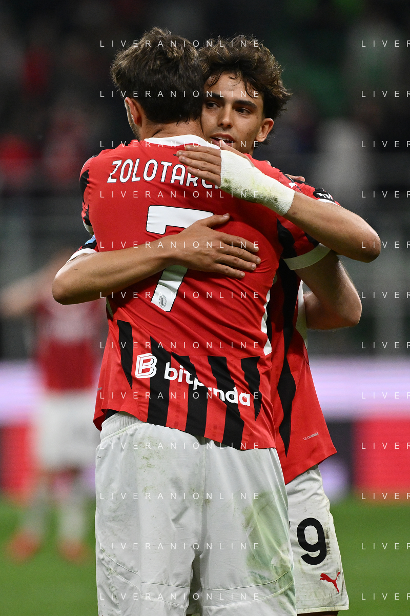 Milan vs Bologna nella foto Santiago Gimenez (Milan) e Joao Felix Sequeira (Milan) esultanza dopo il gol del 3 a 1 Milano 09-05-2025 Stadio Giuseppe Meazza - San Siro Campionato Serie A Enilive - 36a giornata foto Roberto Garavaglia/Agenzia Aldo Liverani sas