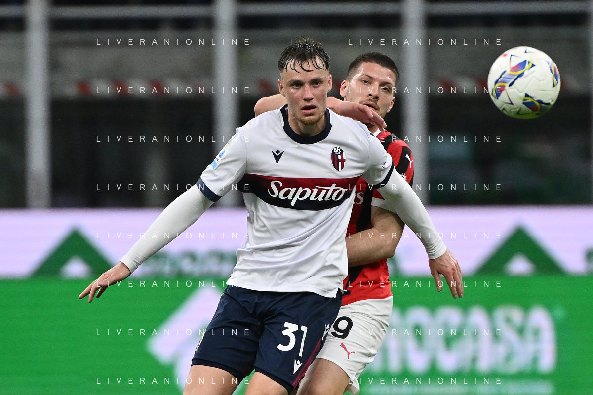 Milan vs Bologna nella foto Sam Beukema (Bologna) e dietro Luka Jovic (Milan) Milano 09-05-2025 Stadio Giuseppe Meazza - San Siro Campionato Serie A Enilive - 36a giornata foto Roberto Garavaglia/Agenzia Aldo Liverani sas
