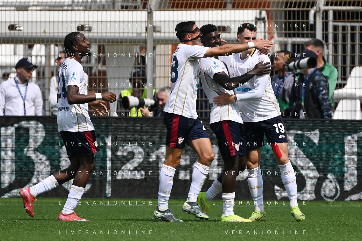 TVRG Como vs Cagliari nella foto giocatori Cagliari esultanza dopo il gol dell'1 a 0 Como 10-05-2025 Stadio Giuseppe Sinigaglia Campionato Serie A Enilive - 36a giornata foto Roberto Garavaglia/Agenzia Aldo Liverani sas