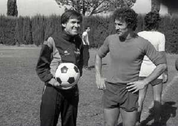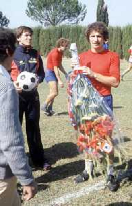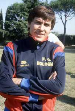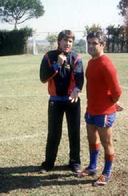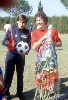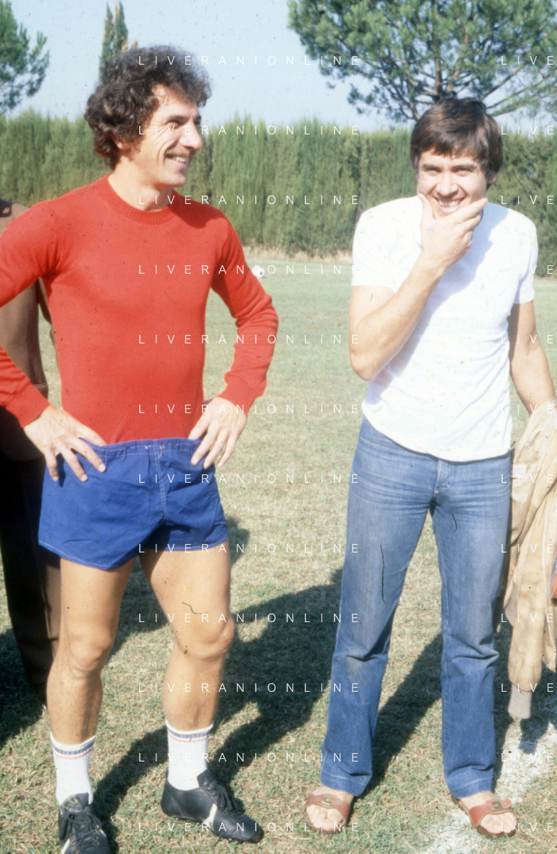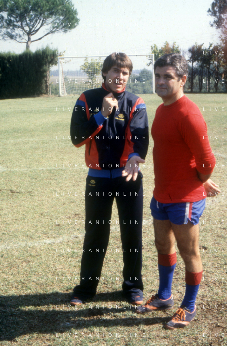 DIAP-RETROSPETTIVA GIANNI MORANDI CANTANTE NELLA FOTO GIANNI MORANDI A BOLOGNA IN VISITA AL FC BOLOGNA CALCIO NELL'ANNO 1979 CON GIUSEPPE SAVOLDI AG ALDO LIVERANI SAS