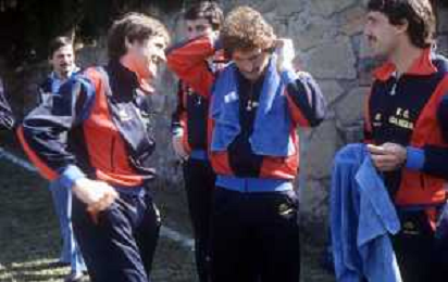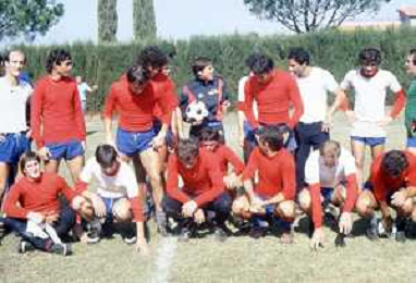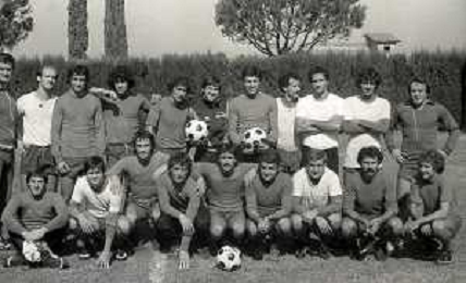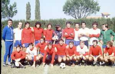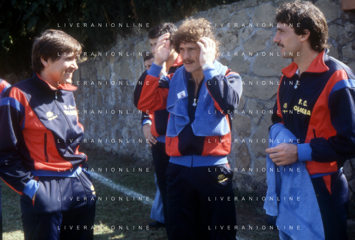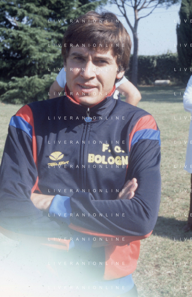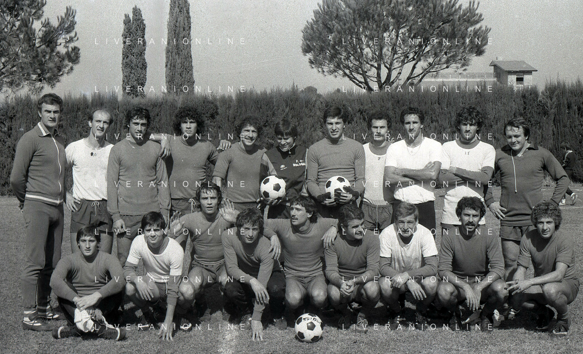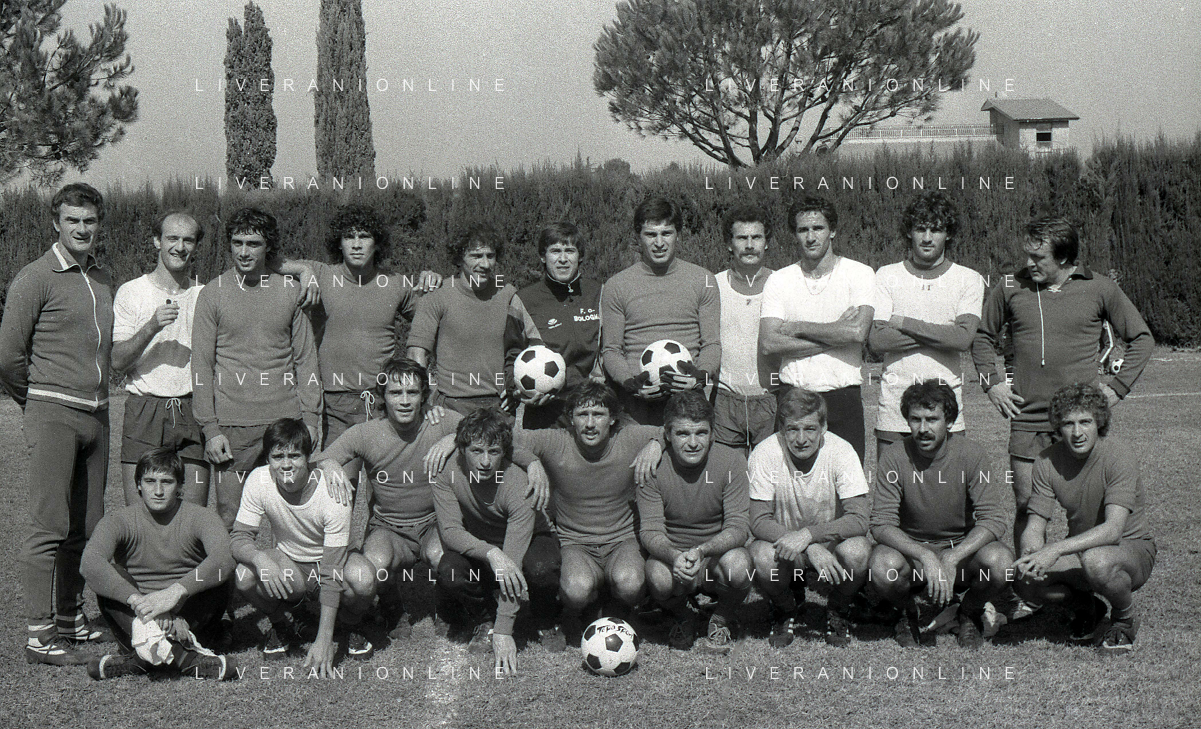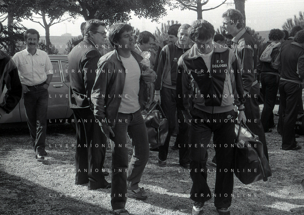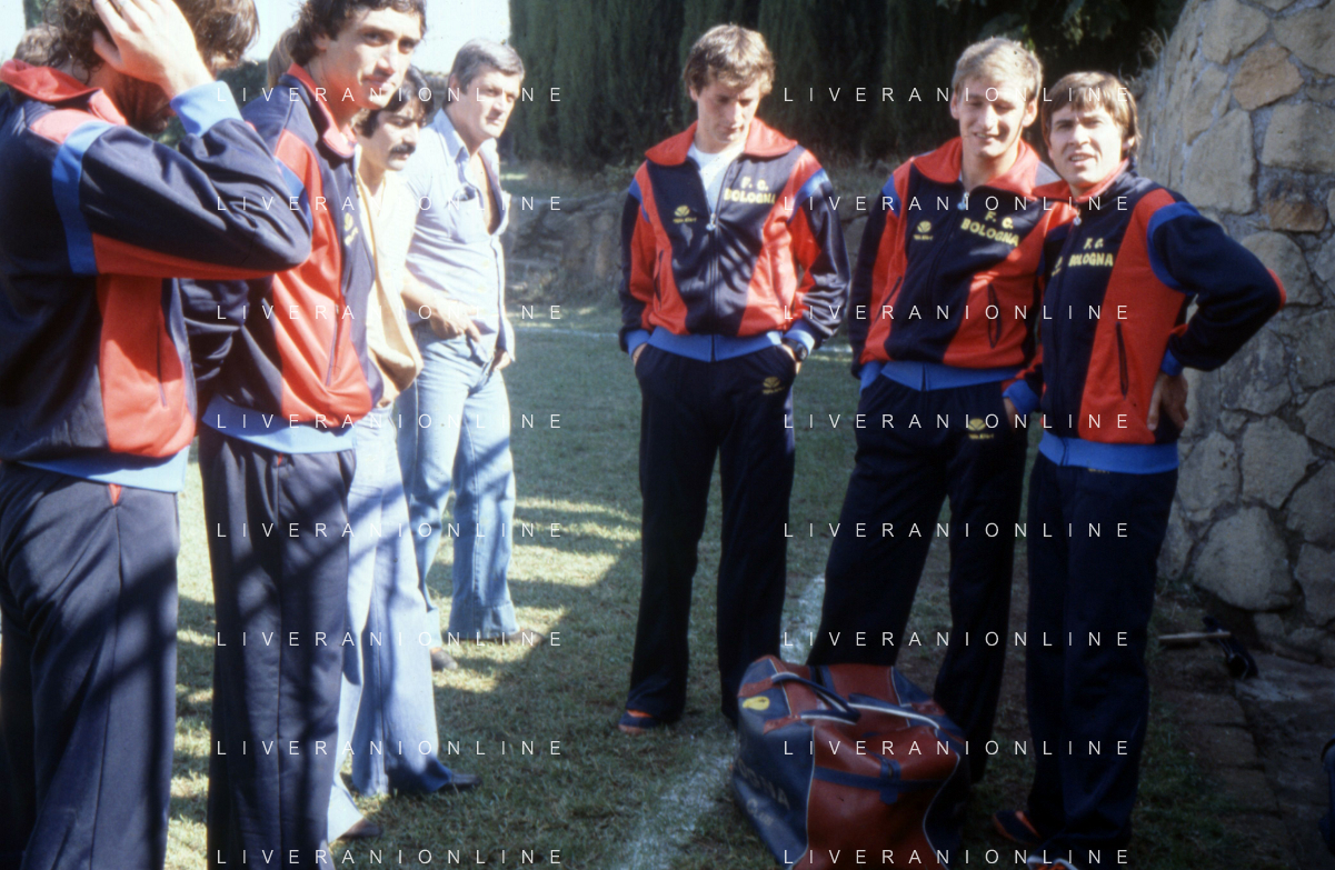 DIAP-RETROSPETTIVA GIANNI MORANDI CANTANTE NELLA FOTO GIANNI MORANDI A BOLOGNA IN VISITA AL FC BOLOGNA CALCIO NELL'ANNO 1979 CON BACHLENECKER KLAUS E DOSSENA GIUSEPPE AG ALDO LIVERANI SAS