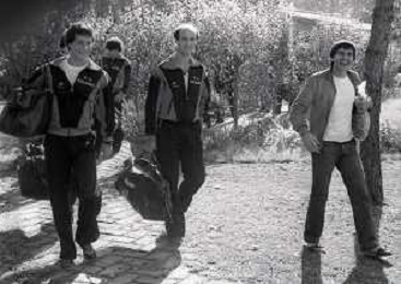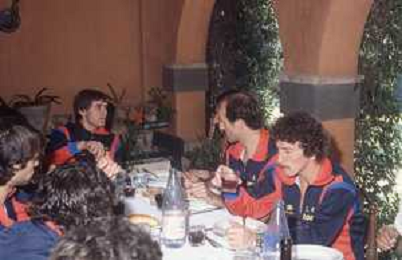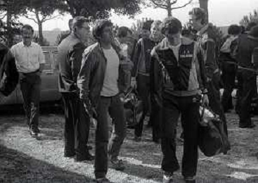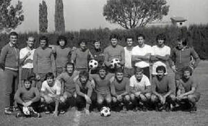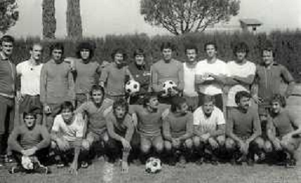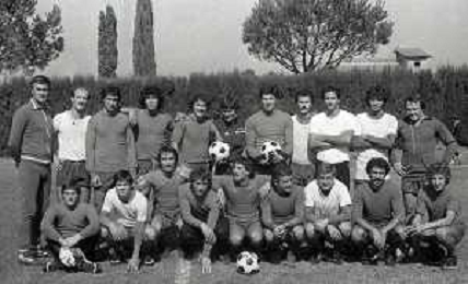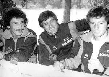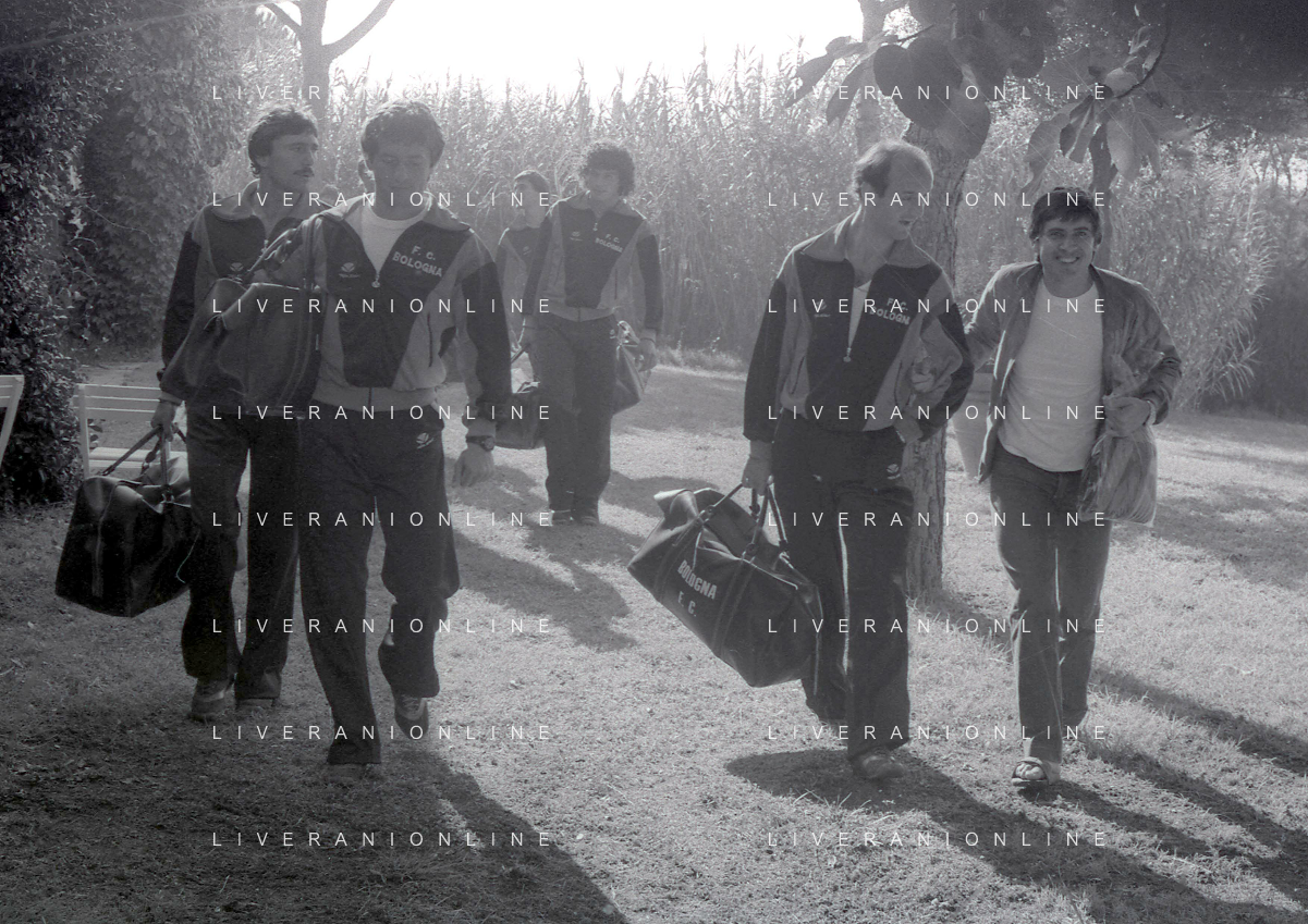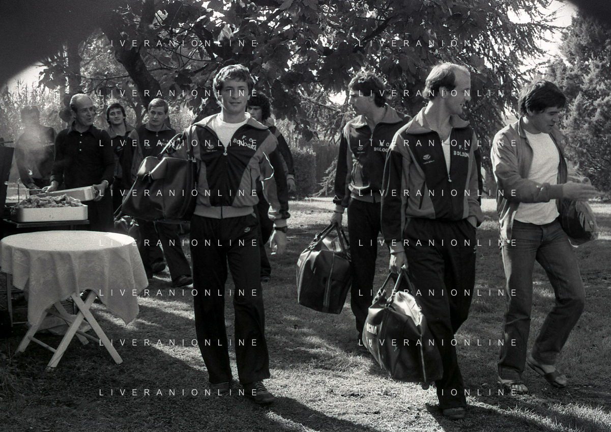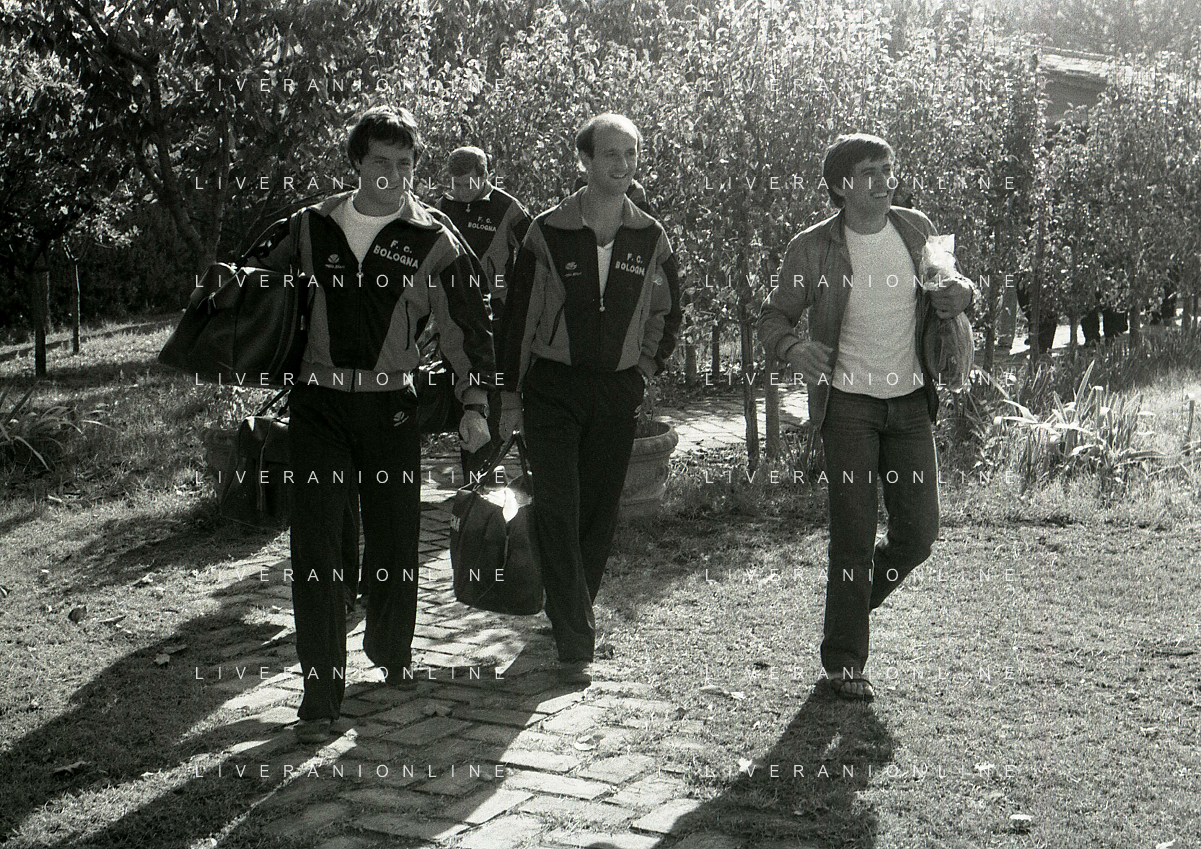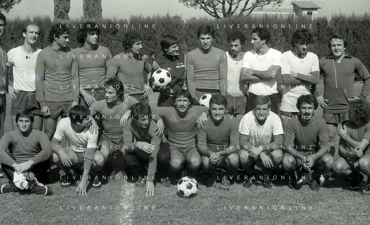 NEG-RETROSPETTIVA GIANNI MORANDI CANTANTE NELLA FOTO GIANNI MORANDI CON ADELMO PARIS E GIUSEPPE DOSSENA BOLOGNA CALCIO NELL'ANNO 1979 AG ALDO LIVERANI SAS