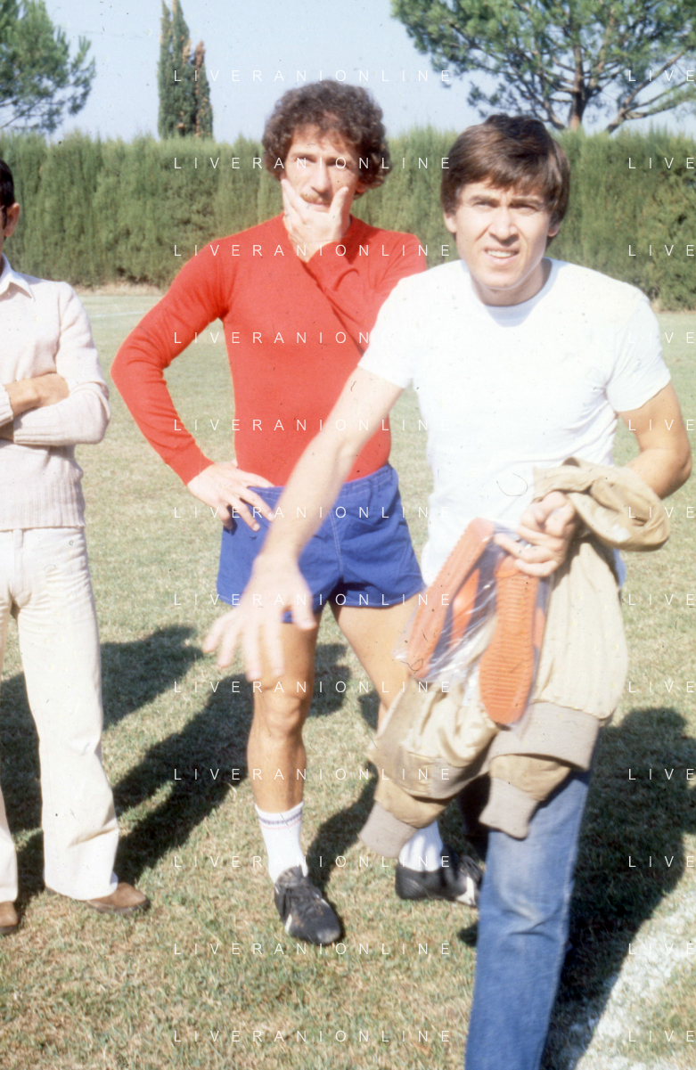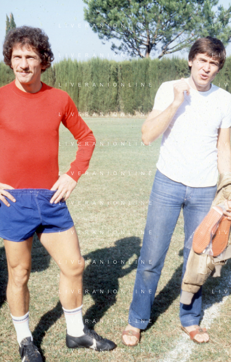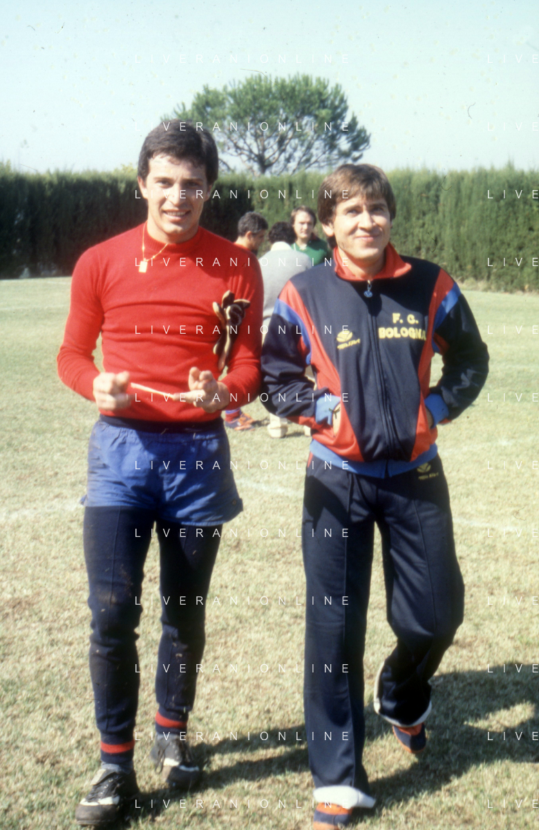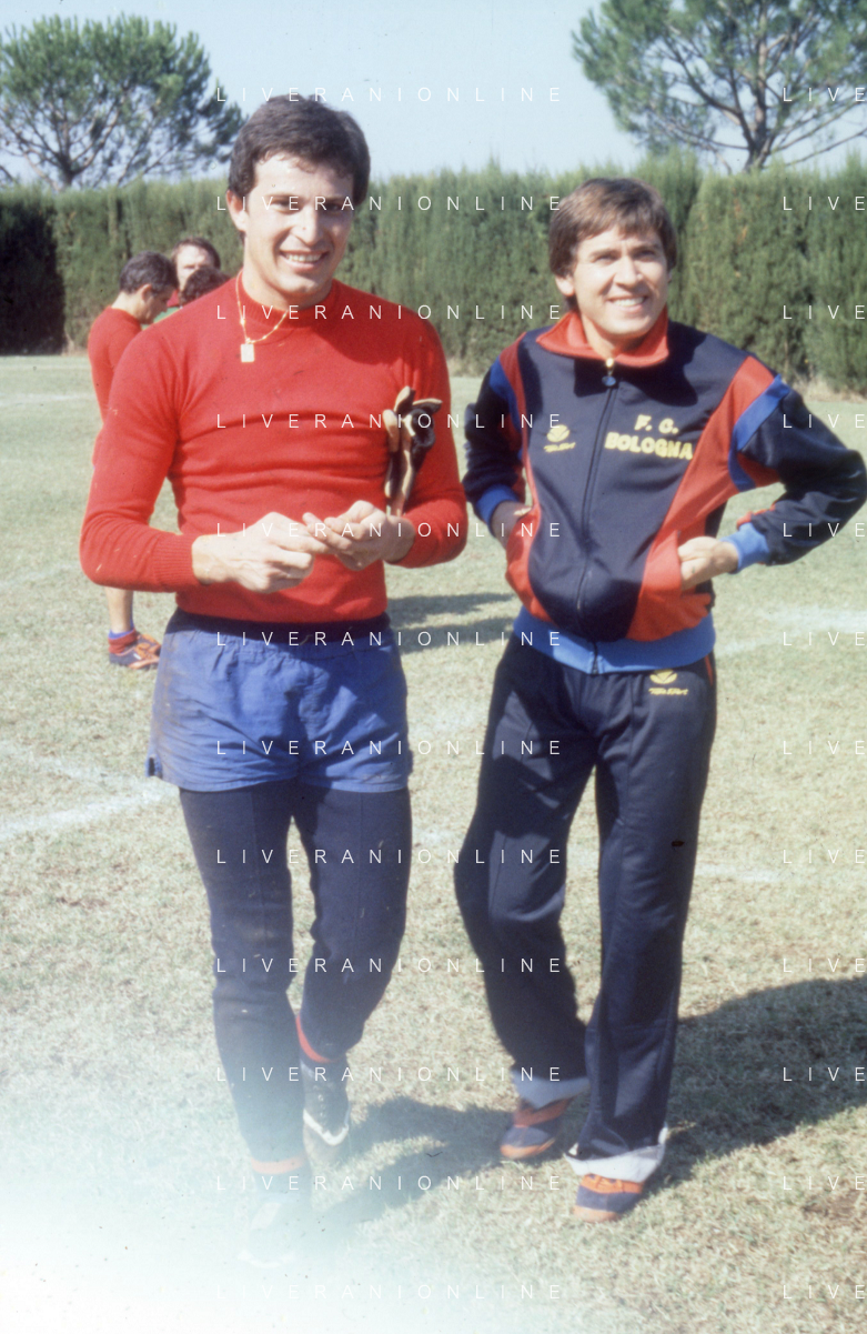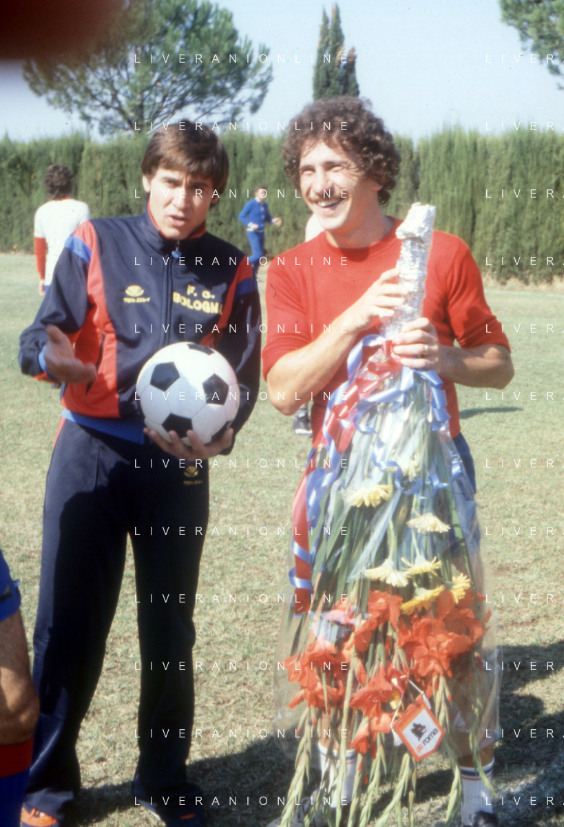 NEG-RETROSPETTIVA GIANNI MORANDI CANTANTE NELLA FOTO GIANNI MORANDI CON GIUSEPPE SAVOLDI GIOCATORI DEL BOLOGNA CALCIO NELL'ANNO 1979 AG ALDO LIVERANI SAS