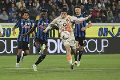 Manu Kone’ of AS Roma battle for the ball with Charles De Ketelaere of Atalanta BC during Atalanta BC vs AS Roma, 36° Serie A Enilive 2024-25 game at Gewiss stadium in Bergamo (BG), Italy, on May 12, 2025. (Photo by Davide Casentini)- AGENZIA ALDO LIVERANI SAS